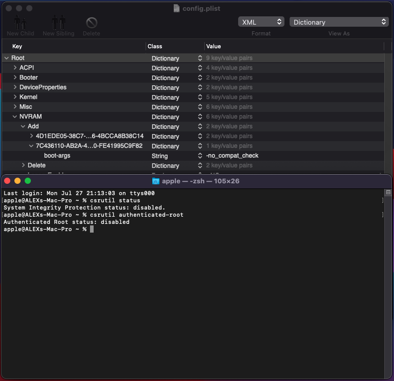 77080000, which makes no sense when converted to binary so Dortania manual is not correct:And while not an issue, SIP has now gained a new bit so to properly disable SIP you need to set csr-active-config to FF0F0000. See here for more info: Disabling SIP