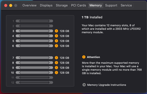 8 DIMMs is the one we need, note still shows 12 slots. I have configured it on 12 slots scheme because I did not want to see the notification, which as no incidence whatsoever. You would put 1.5TB memory config that it would not change anything.