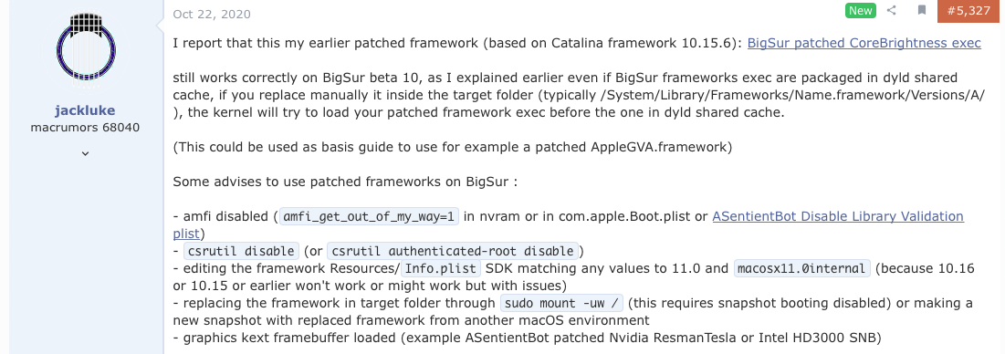 Found your comment in different thread, these steps should still work? Even easier by adding AMFI as a OC boot-arg and disabling SIP using it too.Through pikeralpha method I patched the CoreBrightness binary exec, but to use patched frameworks you need also to Disable Library Validation or AMFI disabled, that I already included in my BaseSystem fix.