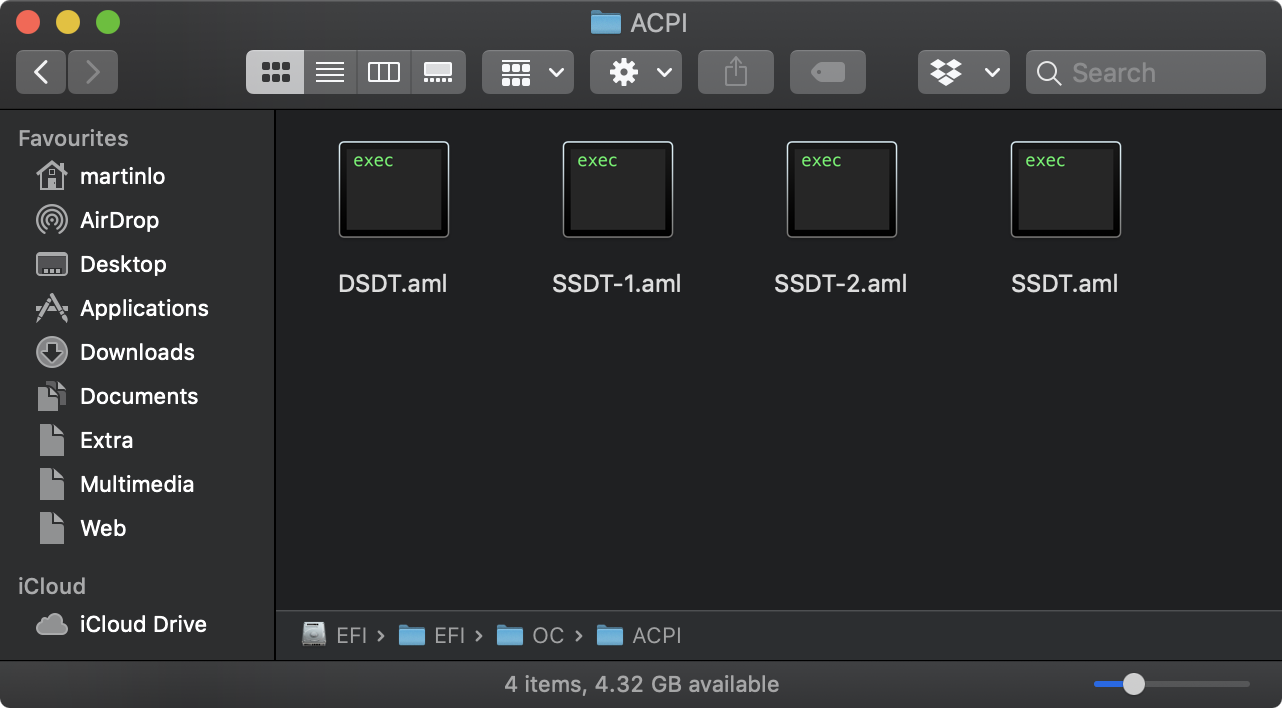 Code:<key>ACPI</key> <dict> <key>Add</key> <array> <dict> <key>Comment</key> <string>Original 5,1 DSDT</string> <key>Enabled</key> <true/> <key>Path</key> <string>DSDT.aml</string> </dict> <dict> <key>Comment</key> <string>Original 5,1 SSDT</string> <key>Enabled</key> <true/> <key>Path</key> <string>SSDT.aml</string> </dict> <dict> <key>Comment</key> <string>Original 5,1 SSDT-1</string> <key>Enabled</key> <true/> <key>Path</key> <string>SSDT-1.aml</string> </dict> <dict> <key>Comment</key> <string>Original 5,1 SSDT-2</string> <key>Enabled</key> <true/> <key>Path</key> <string>SSDT-2.aml</string> </dict> </array>