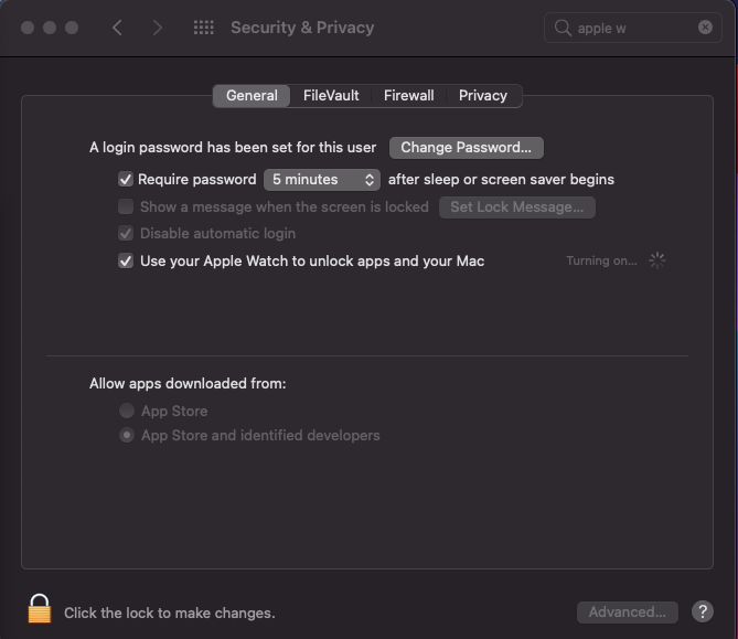I can't get handoff or Apple Watch unlock working. Allow handoff is enabled and I get the following for Apple Watch unlock but it never enables;
