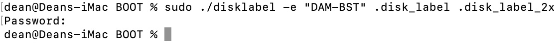 sudo ./disklabel -e "YourLabel" .disk_label .disk_label_2xReally appreciate the response! The addition of sudo got me a little farther (see screenshot). I have a couple of follow up questions: 1. If I have several GPT drives I want to label, do I need to place the disklabel utility inside each disk's EFI/Boot folder, navigate to those folders in terminal, and repeat the process? 2. If so, I might have been inside the wrong EFI folder, and incorrectly labelled a disk. Are you aware of a way to remove a label?