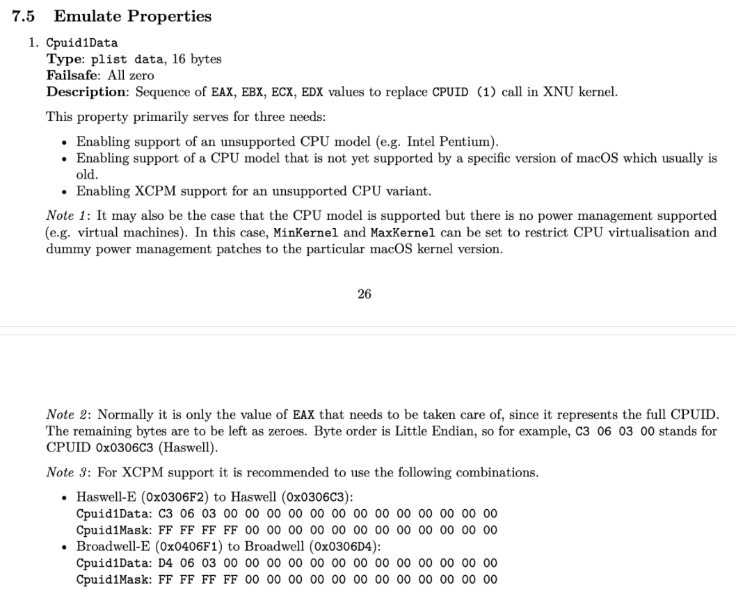@cdf about the Cpuid1Data and Cpuid1Mask, the failsafe Hex values should be 16 bytes all zeroes 00 00 00 00 00 00 00 00 00 00 00 00 00 00 00 00, see #85. Your config.plist should include also these failsafe values.