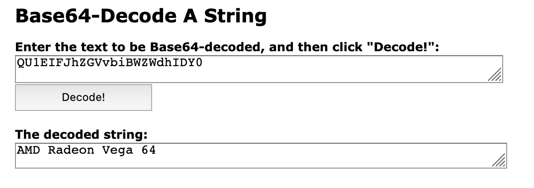 Here is the Base64 "QU1EIFJhZGVvbiBWZWdhIDY0" ...If I go this route.