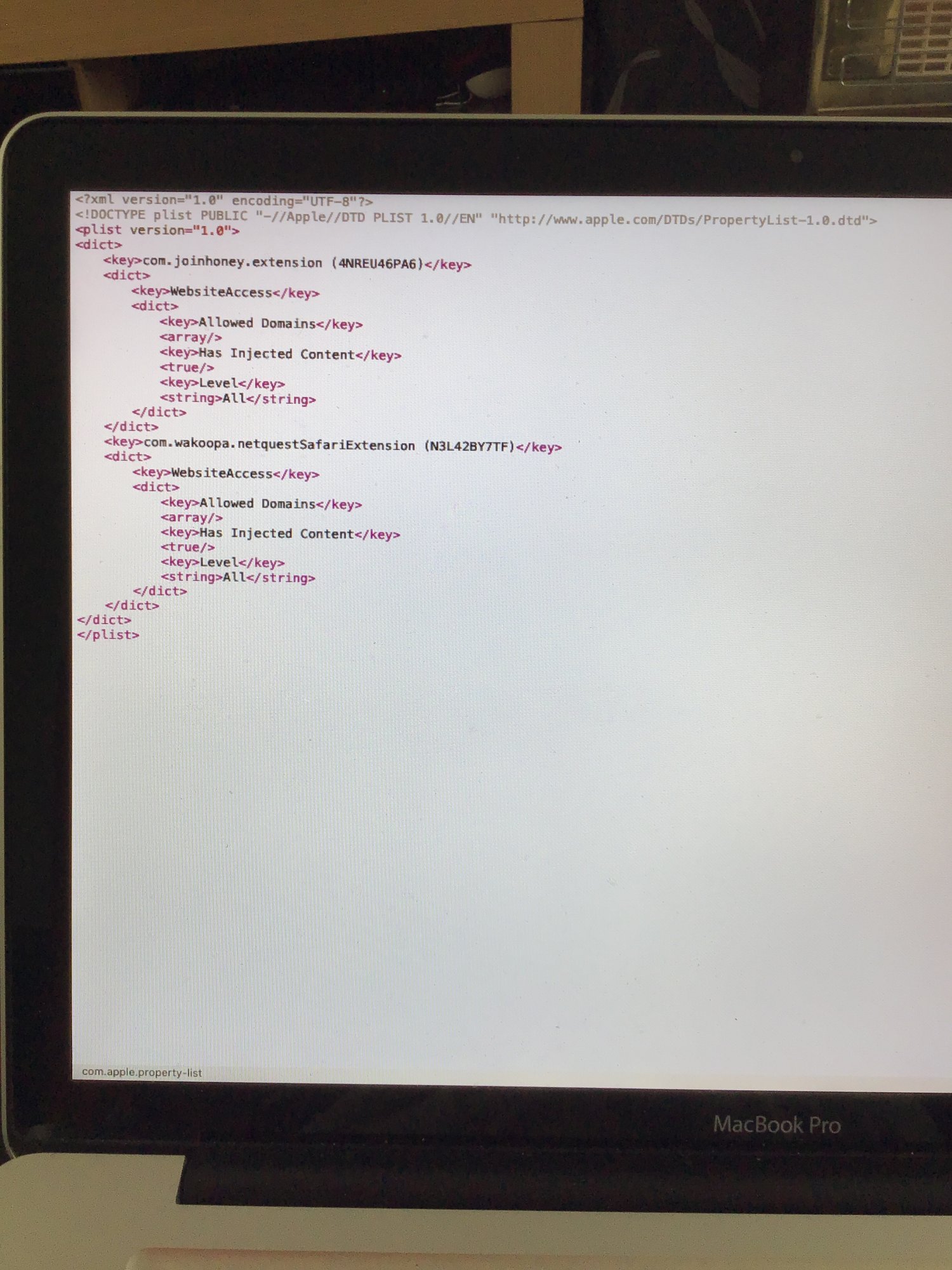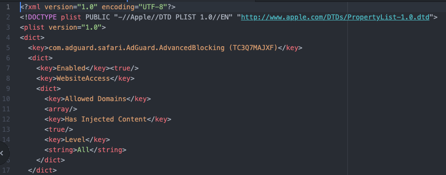 XML:<?xml version="1.0" encoding="UTF-8"?><!DOCTYPE plist PUBLIC "-//Apple//DTD PLIST 1.0//EN" "http://www.apple.com/DTDs/PropertyList-1.0.dtd"> <plist version="1.0"> <dict> <key>extension.1</key> <dict> <key>Enabled</key> <true/> <key>WebsiteAccess</key> <dict> … </dict> </dict> <key>extension.2</key> … </dict> </plist> - Save