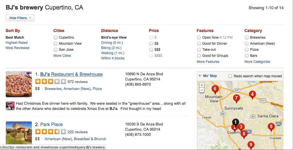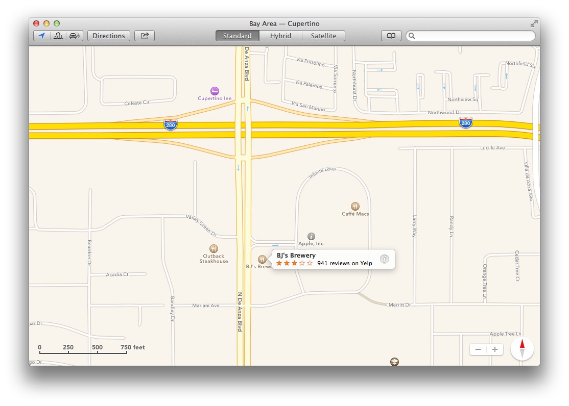 Attached is two screenshots - one is the mouseover on Maps.app showing the # of reviews; another is showing the same place at the Yelp website.