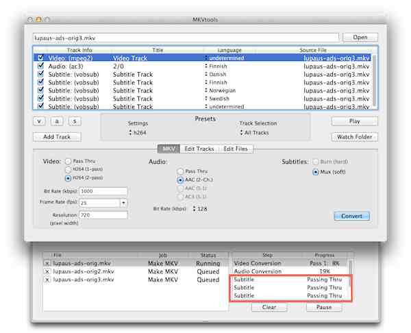 After dragging the file(s) to MKVTools and making sure you select the right preset (and also “All tracks” in the right-side “Track Selection” menu), just click Convert in the lower right corner and the mass-remuxing will start. An example also showing subtitle tracks are also passed thru (annotated at the bottom), while the video and the audio tracks are indeed converted: