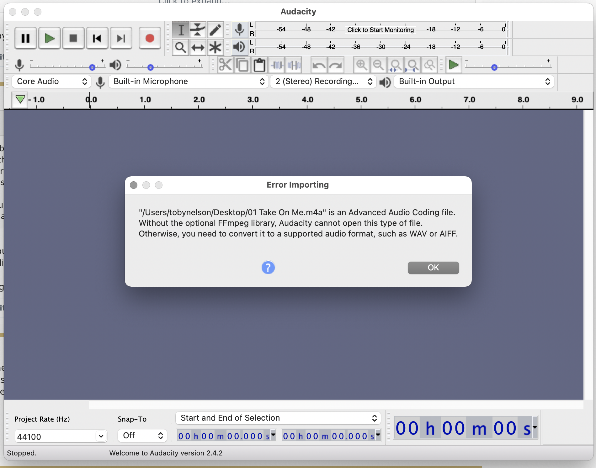 you can locate ffmpeg within Audacity manually. One other thing: because the album preview of your currently not playable files is okay as well the file size feasible, it seems probable that the m4a-container is damaged. If you can’t get audacity&ffmpeg to work it might be worth to give it a shot with a hexditor. This is tedious but maybe worth a shot.