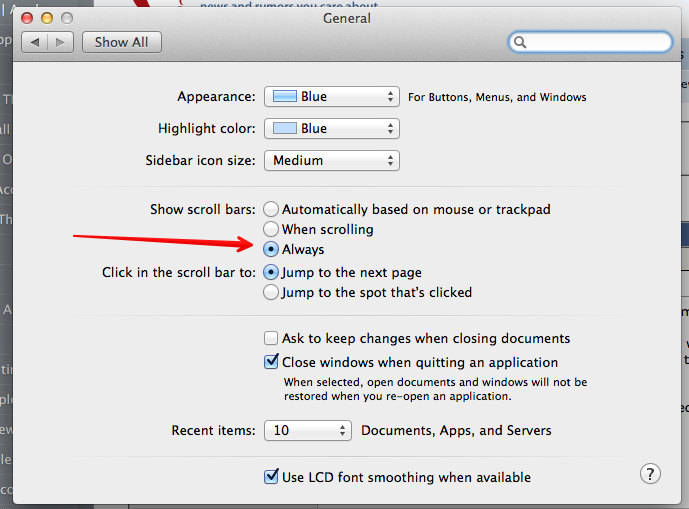 When I click on any of my folders in the side dock, the window that opens has no scroll bar at the side for me to get down to the items out of sight. So now I have to go in through Macintosh HD, sidebar to access all of the items in my applications folder.
