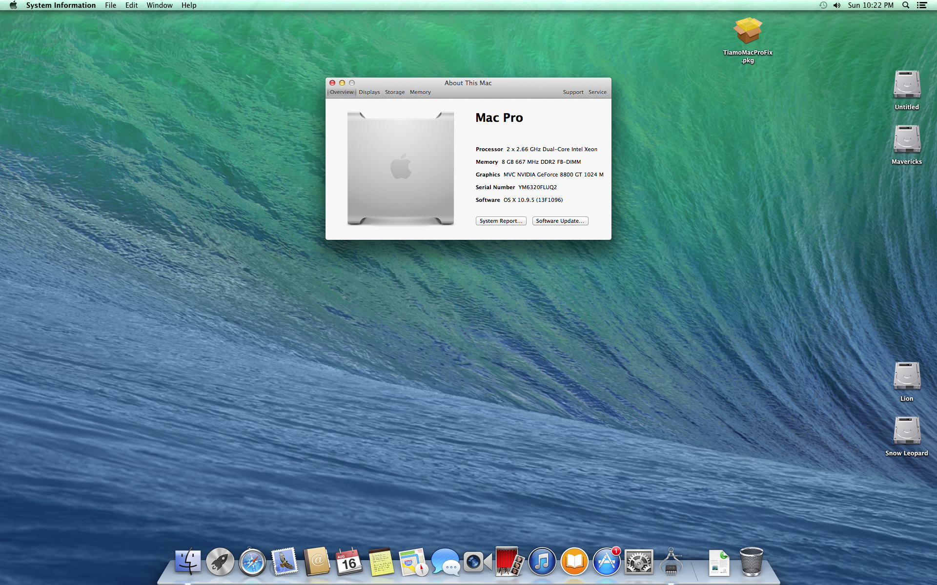 For general information-it's 2xdual 2.66 with 8gb RAM. It has the factory GEForce 7300GT installed, along with an GeForce 210 on an Asus "Quiet" card with 1gb VRAM. The person from whom I bought the computer said he had Yosemite running fine with the second card.