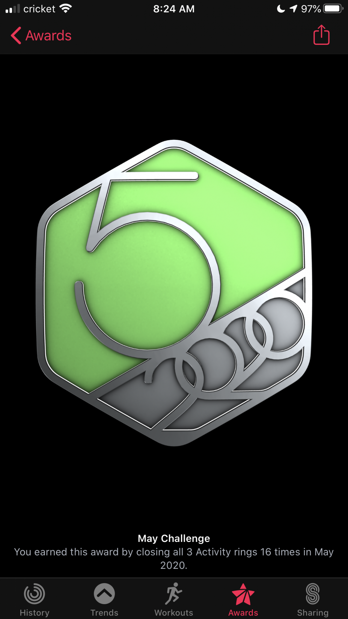 Walks don't register all my time as exercise, so I'll jog or do jumping jacks to try and keep my heart rate high enough to get credit.Mine was the 2050 exercise minutes per month. I finished a few days ago. Annoyed at how often I need to use the 'other' workout as despite walking at a brisk pace, my 2+ mile walks rarely give me enough exercise minutes.