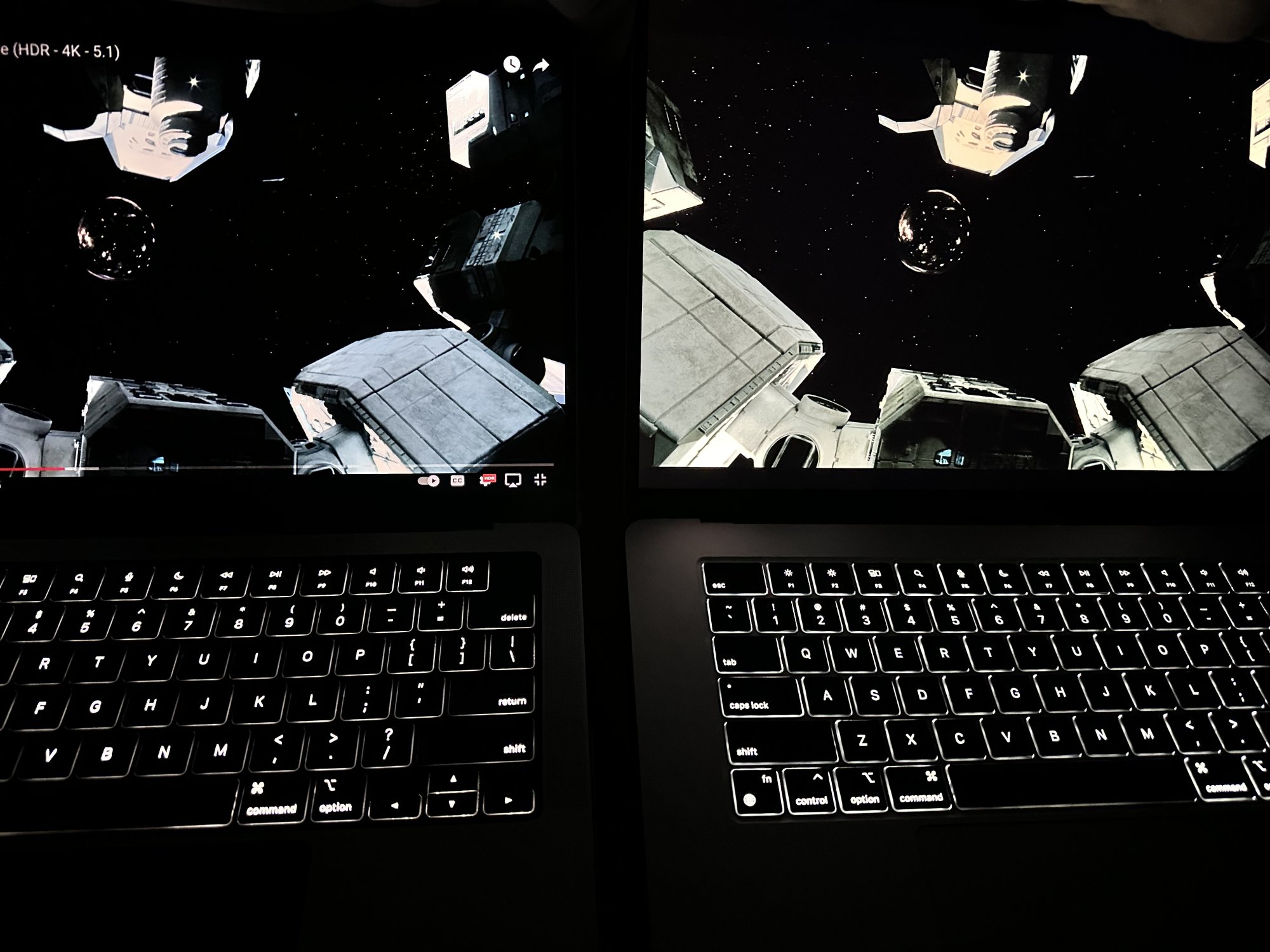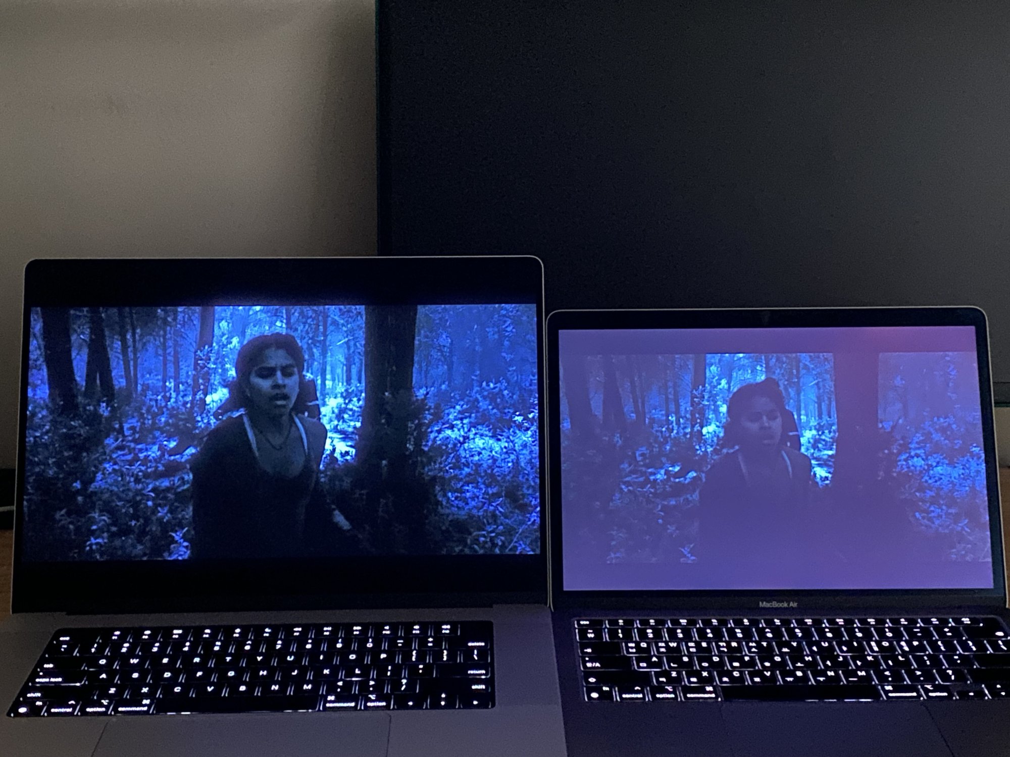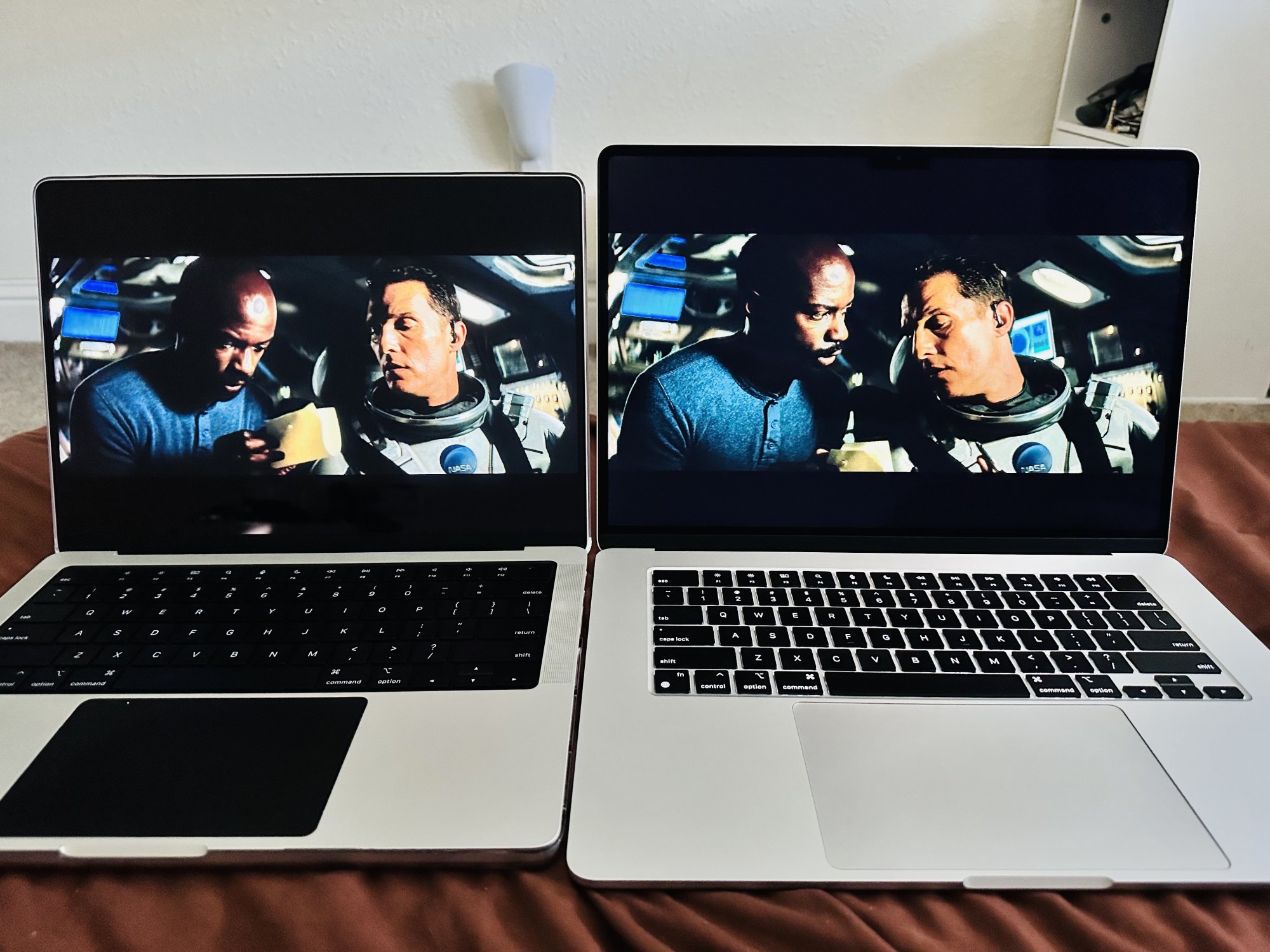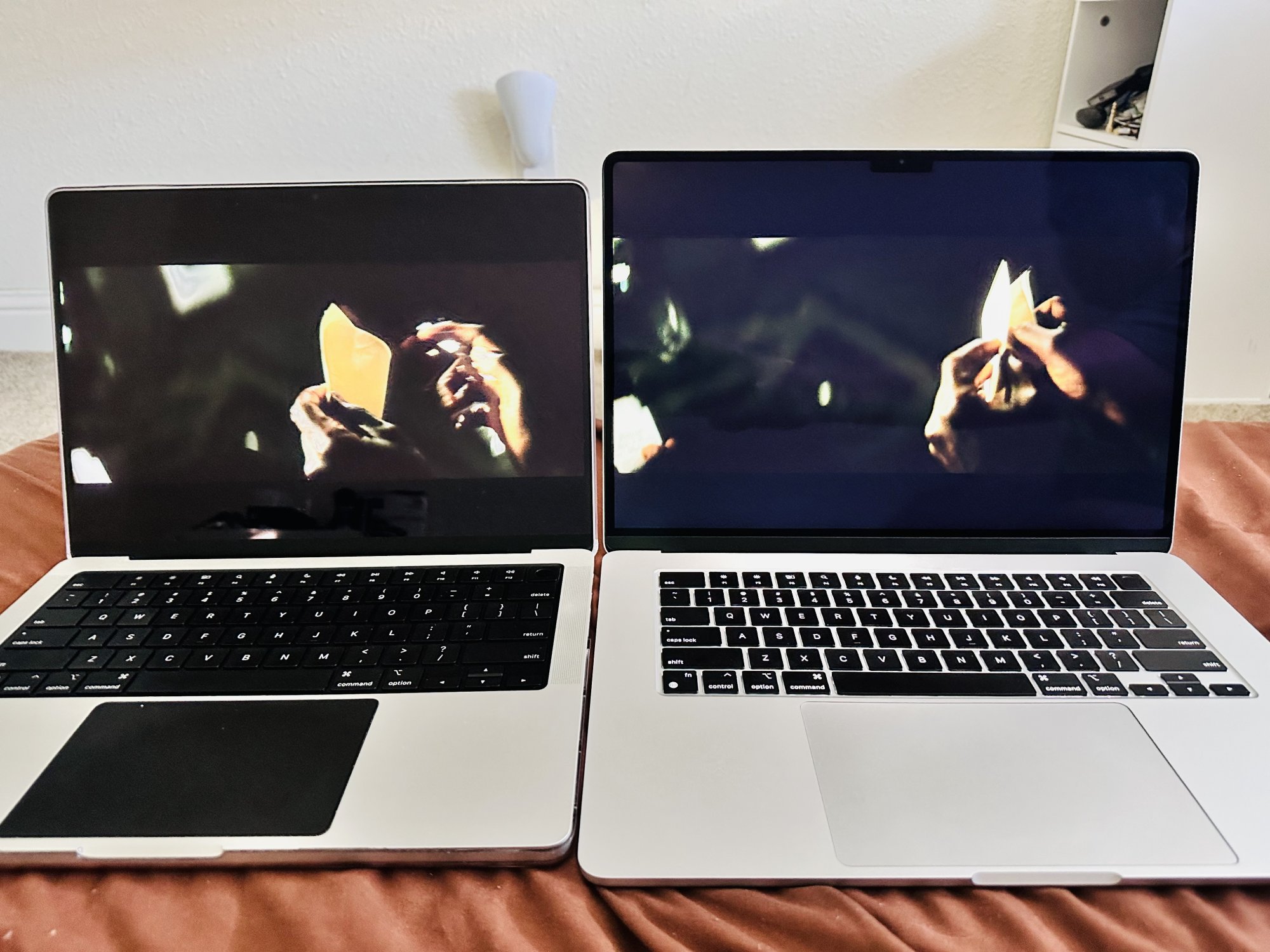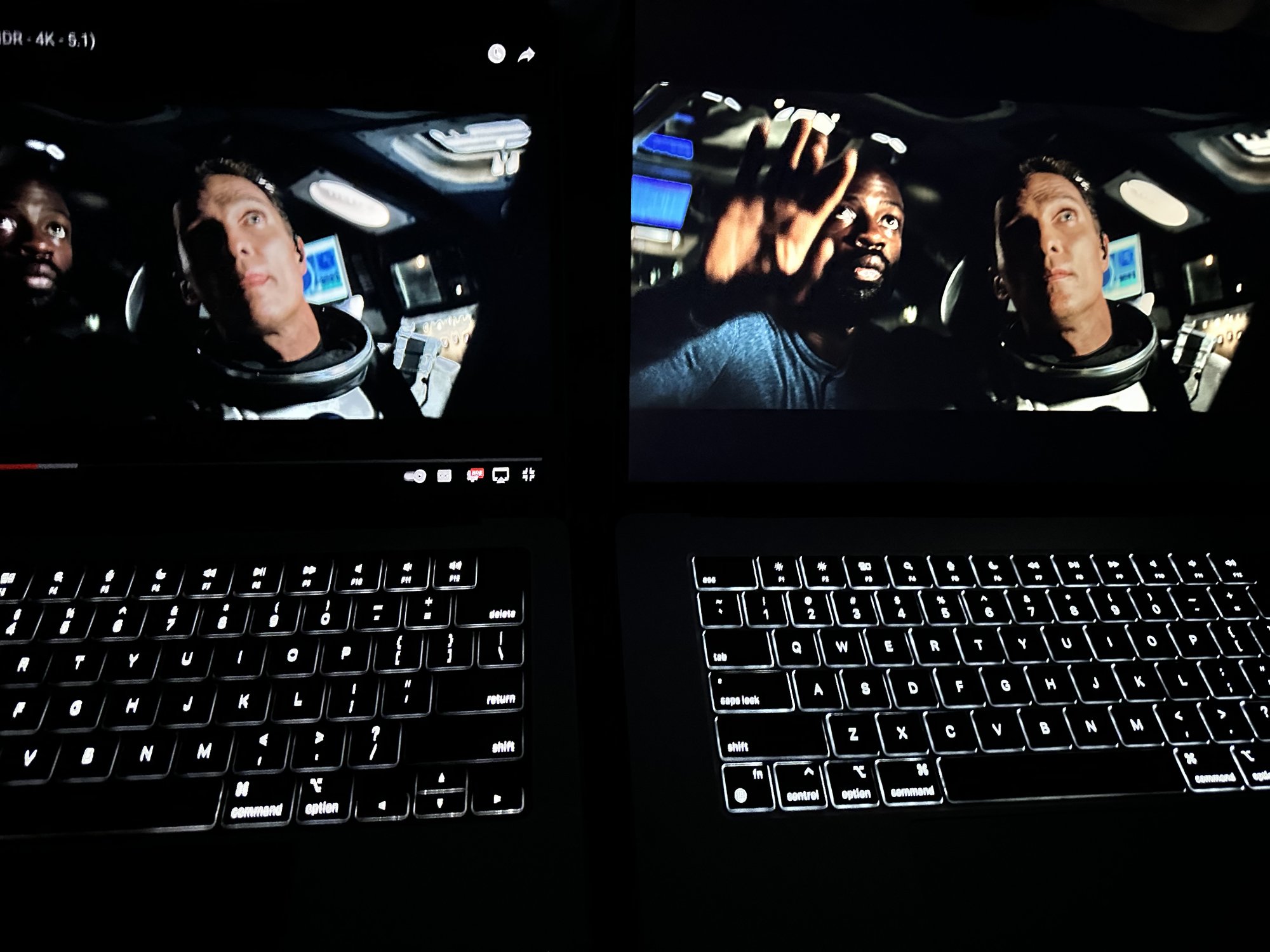 After returning the MBP 14 I hung around for 20 minutes watching 4K HDR videos side-by-side with a demo MBP 14 and MBA 15. The HDR content is brighter and colors are more vivid on the MBP 14, but not by a significant margin to me. It is akin to maybe two more clicks on the brightness meter (I already had both laptops at max brightness). I really had a hard time differentiating the difference between the two screens and had to actively look for it. Even when the background was predominantly black, I had to look at the bottom of the bezel of the MBA 15 to really notice the subtle grayness. The MBA 15 did not look anywhere as bad as the comparisons by