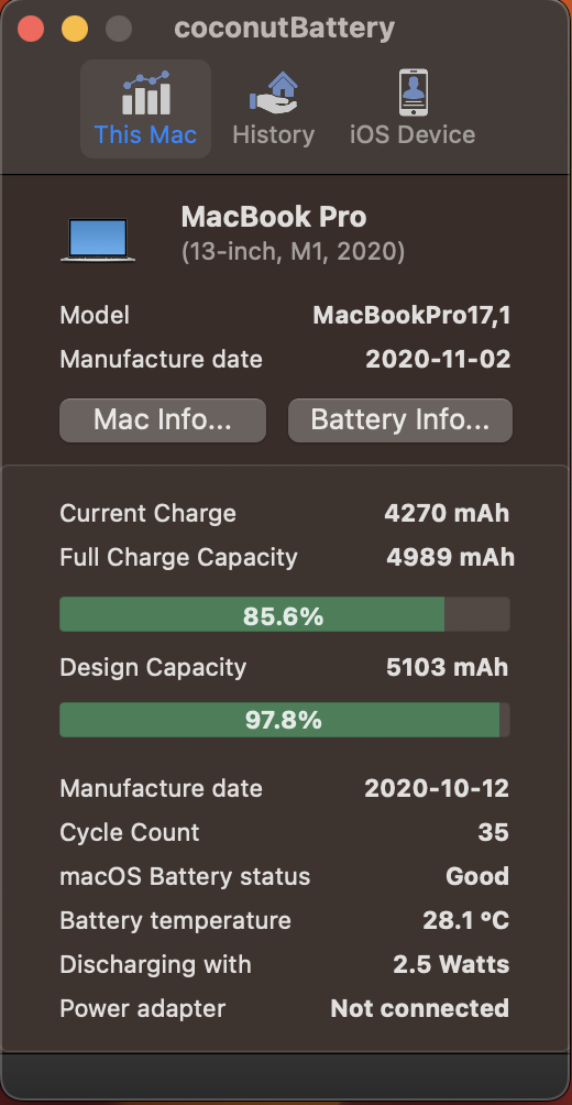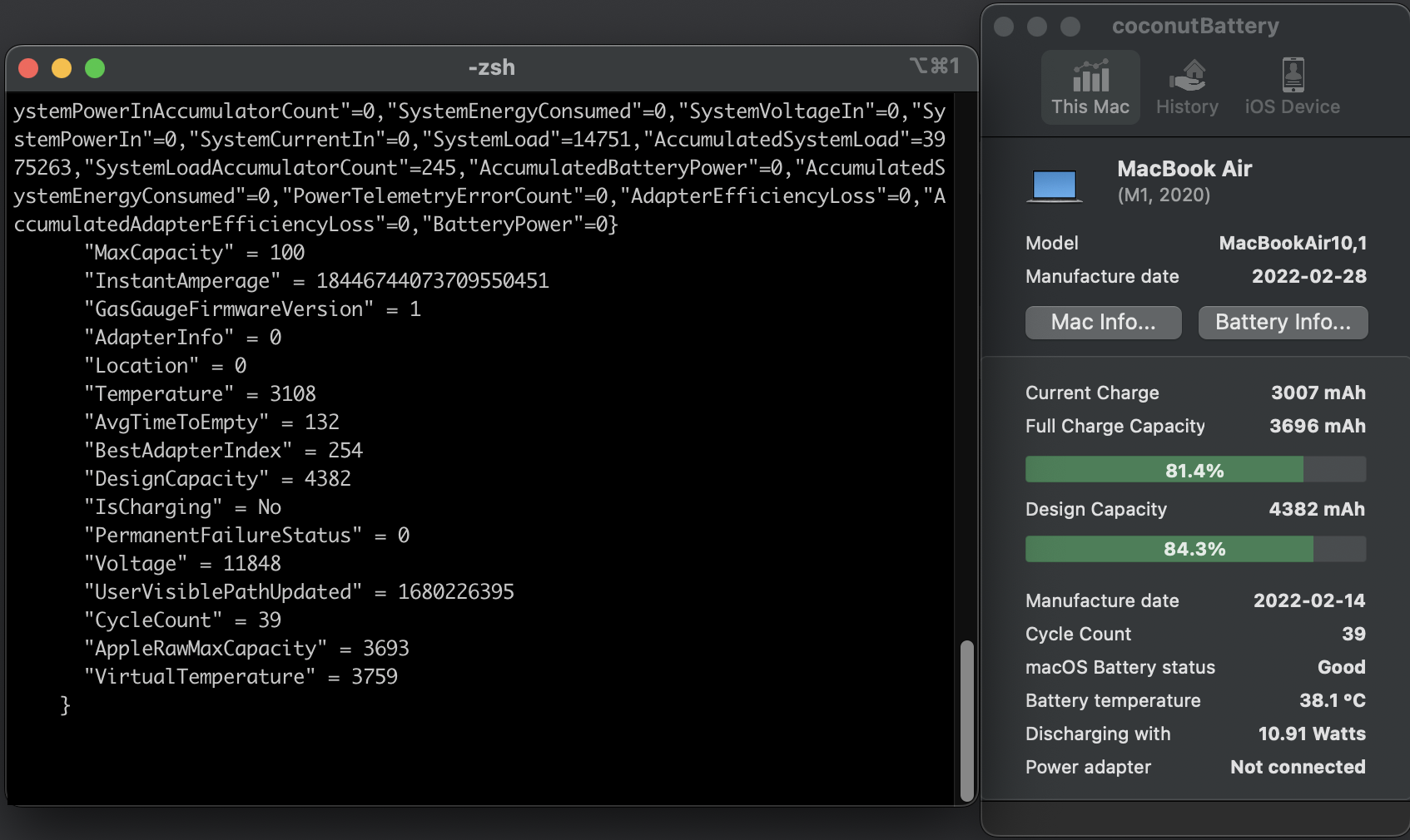 Attached my battery health from terminal and coconutbattery. The numbers look off, is it a problem with the app or my MBA?