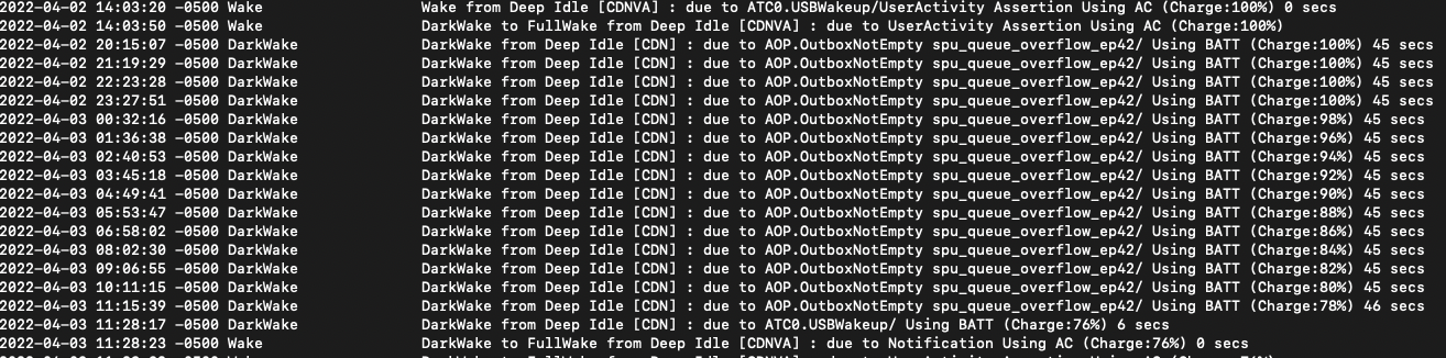 2020-11-19 18:16:23 -0800 DarkWake DarkWake from Deep Idle [CDNP] : due to SMC.OutboxNotEmpty smc.70070000 wifibt wlan DataFrame ARPT/ Using BATT (Charge:75%) 8 secs