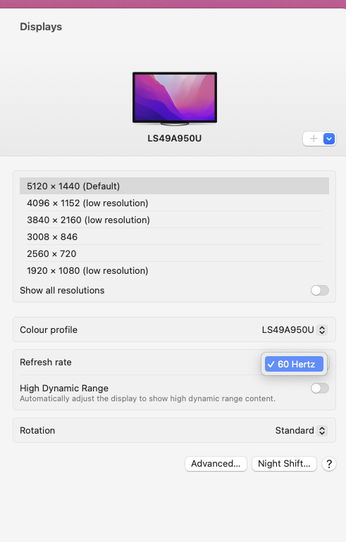 Hi guys, I have a new 32:9 monitor (Samsung LS49A950U) and it supports up to 120hz refresh rate. When I connect my windows PC to it there is no problem, I get 120hz refresh rate however with the MBA M2 15' in the display settings I only get 60hz. I have tried different cables: HDMI, USBC as well as a maxonar thunderbolt 4 cable (2m/40Gbps). The resolution is 5120x1440 but even lowering the resolution will not allow me to pass over 60hz. Is this normal or are there any other settings that I am unaware of?