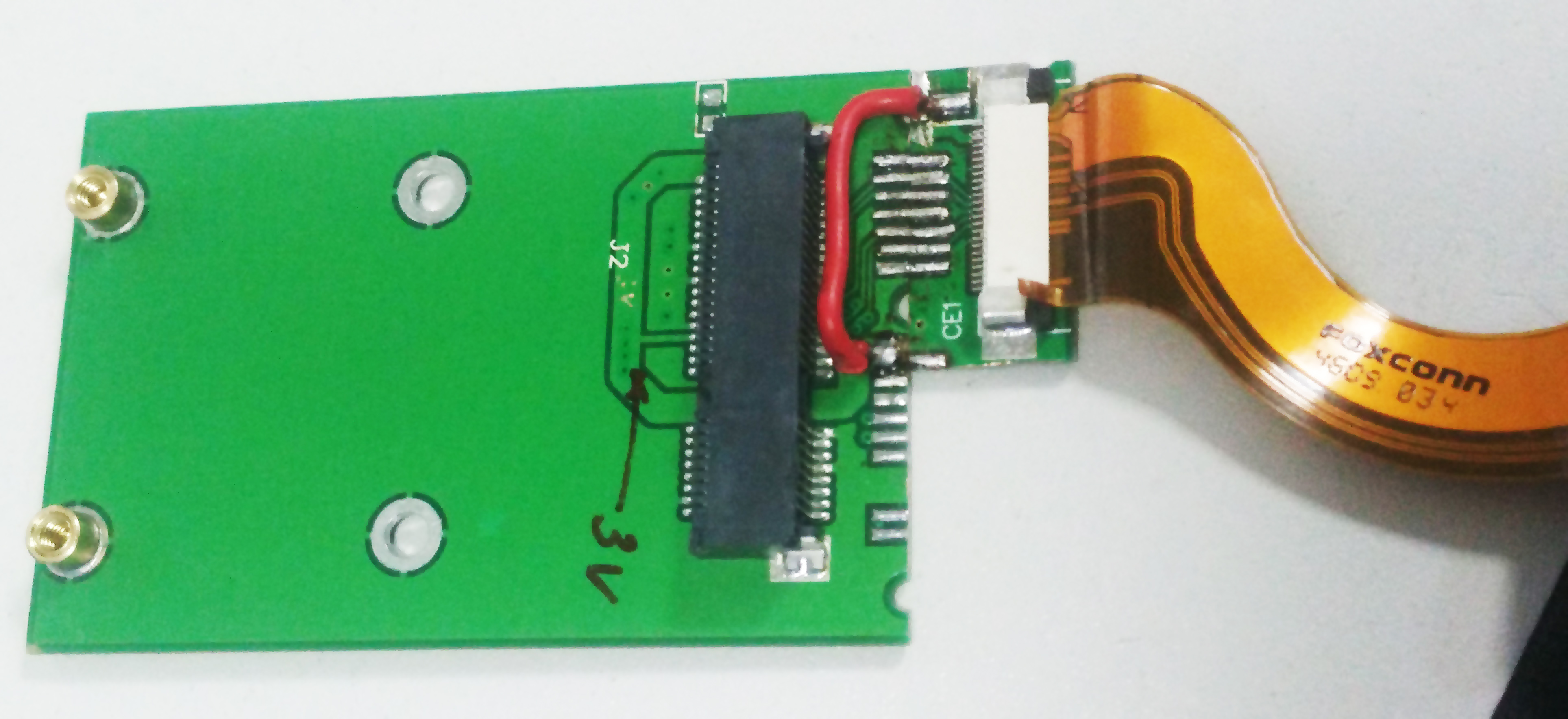 The red jumper wire connects the 3.3V from the LIF24 connector to pin 1 of the micro-SATA power connector, which is connected on the board to the 3.3V pins for the mSATA SSD.
