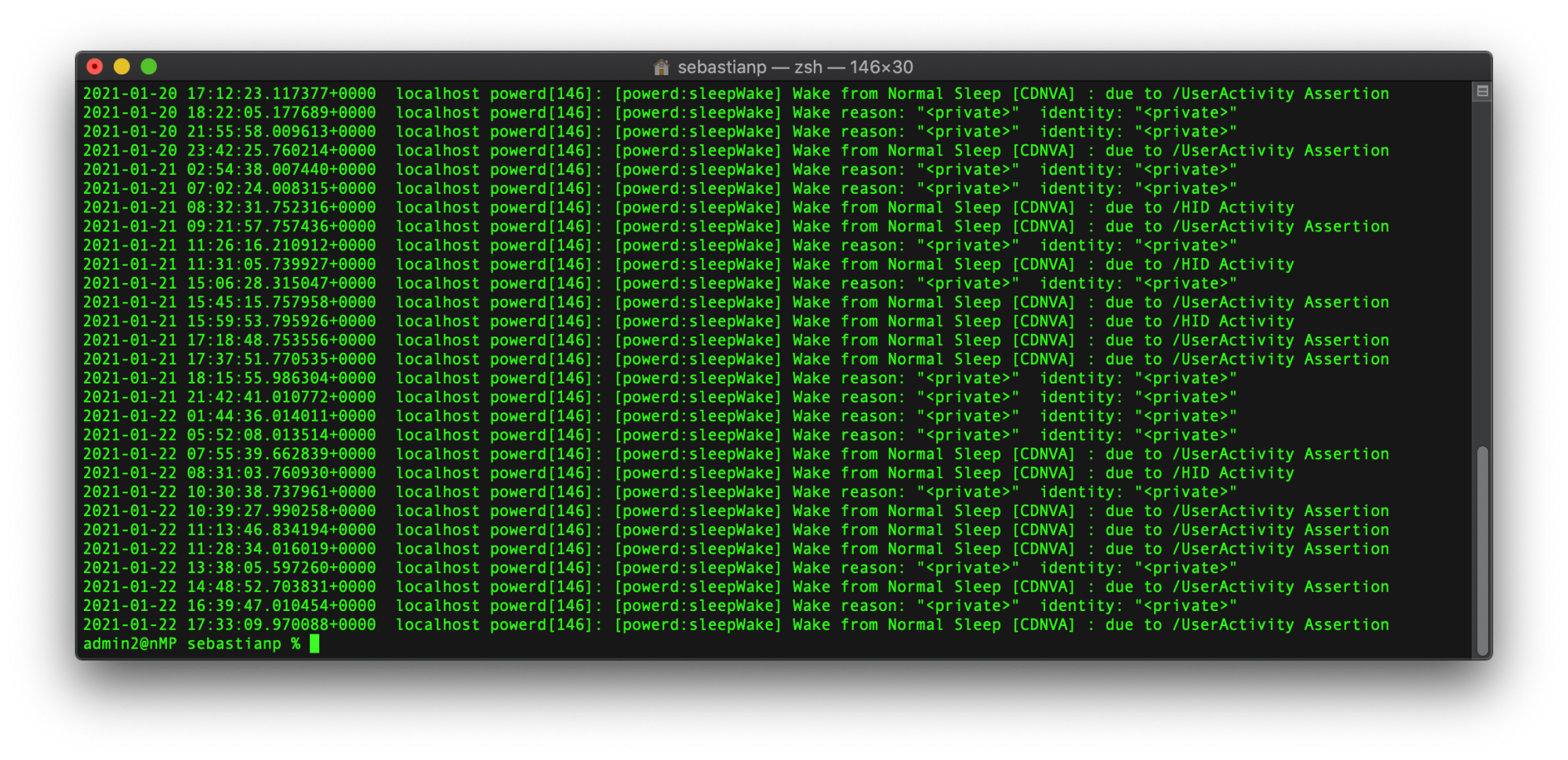 As you can see this computer basically wakes up when I touch the mouse or keyboard (user activity). The private is likely to be calling home (find my Mac etc). Now you need to check the timings when your computer awoke against the log.