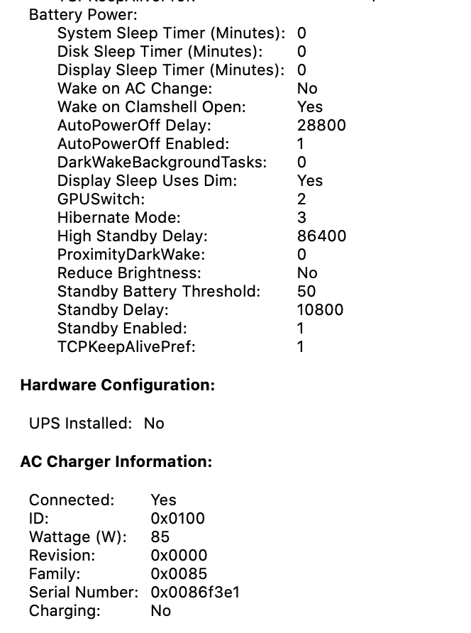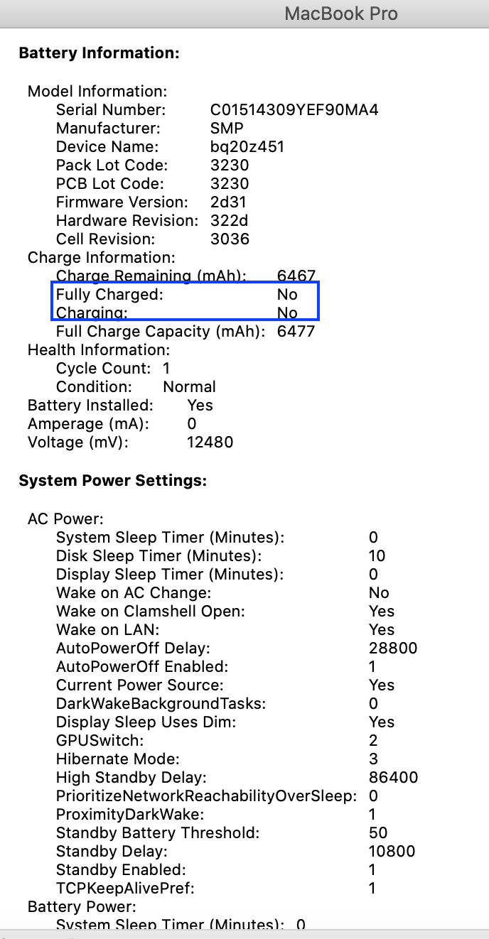 What stood out to me is that for "Charging" and "Fully charged" it says No for both. While the laptop is plugged in and battery status at the top says 100%. Also on the magsafe connector, the green light is on.