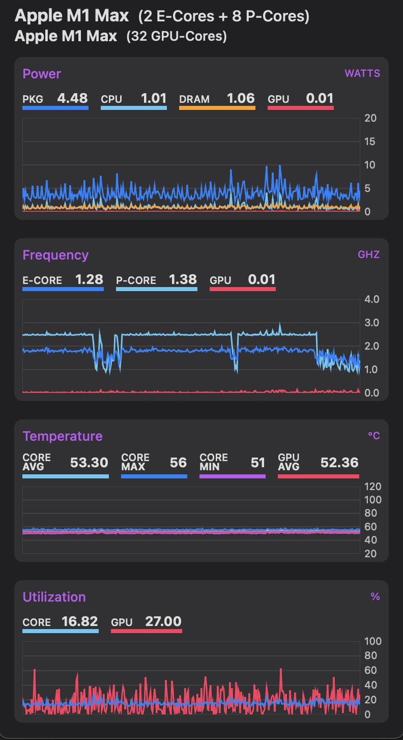 GPU active residency: 3.19% (389 MHz: 1.7% 486 MHz: 0% 648 MHz: 0% 778 MHz: 1.3% 972 MHz: .23% 1296 MHz: 0%)