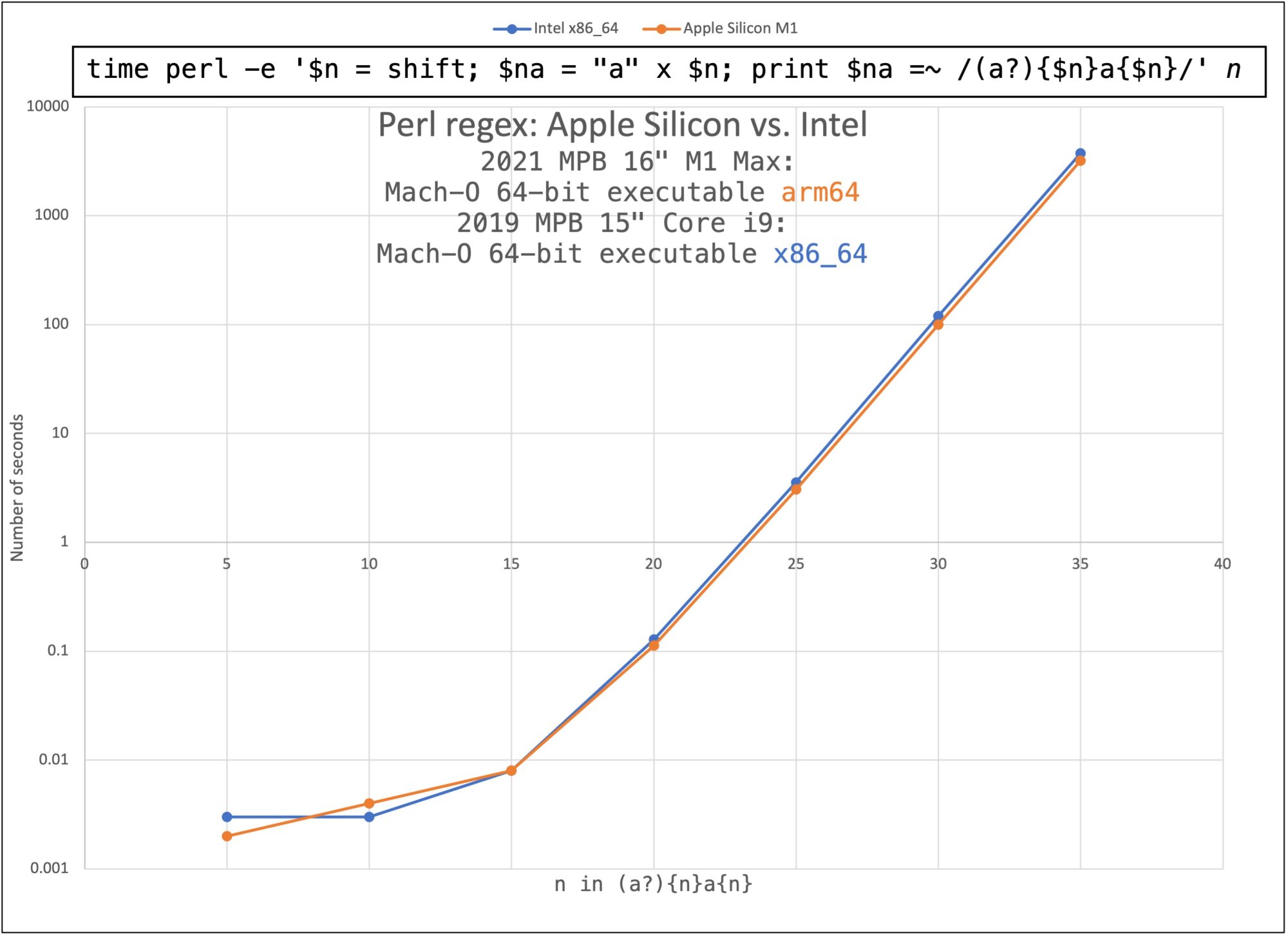 Sometimes I'm not so impressed with my M1 Max MBP 16" (64GB RAM). Sometimes, it seems barely faster than the Core i9 15" (2018) MBP (32 GB RAM) that I also have. I leave one at work and keep one at home, so I rarely compare them side by side. Sure, somethings are perceptively faster, e.g. some Photoshop tasks, but for general tasks, I'm not so sure. So I ran some code that I use for teaching non-determinism. And I'm surprised. The M1 Max and the MBP ran neck and neck on this Perl one-liner. I checked. The Perl executable for the Max is arm64. Perl for the i9 is x86. You can run the same code easily.View attachment 2101246