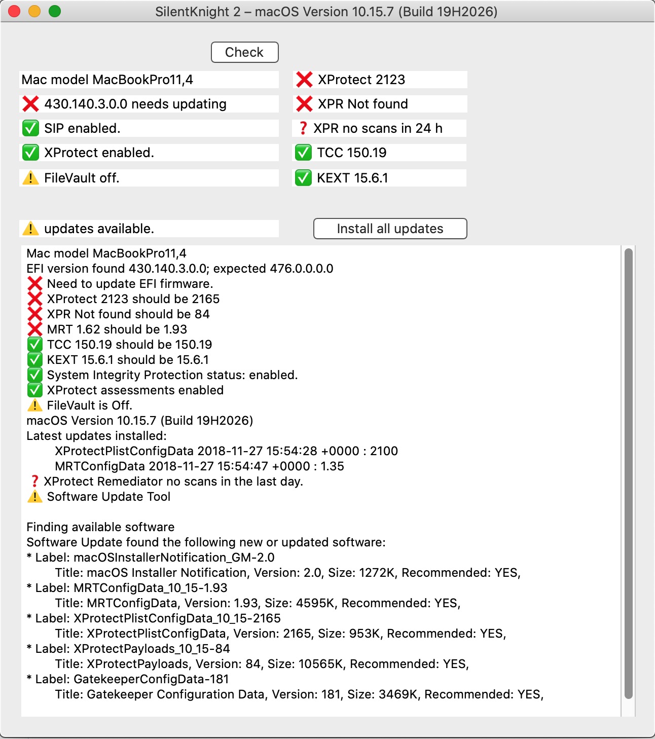 I have read around this could be two things, either a BootRom out of date issue, which I suspect is not the case since this just started happening for the past 2 weeks and I have been using MAC OS Catalina for a good ~6 months. I run SilentKnight just in case but not sure how to interpret the results. BootRom seems out of date but I guess that's expected since I am not on the latest OS?