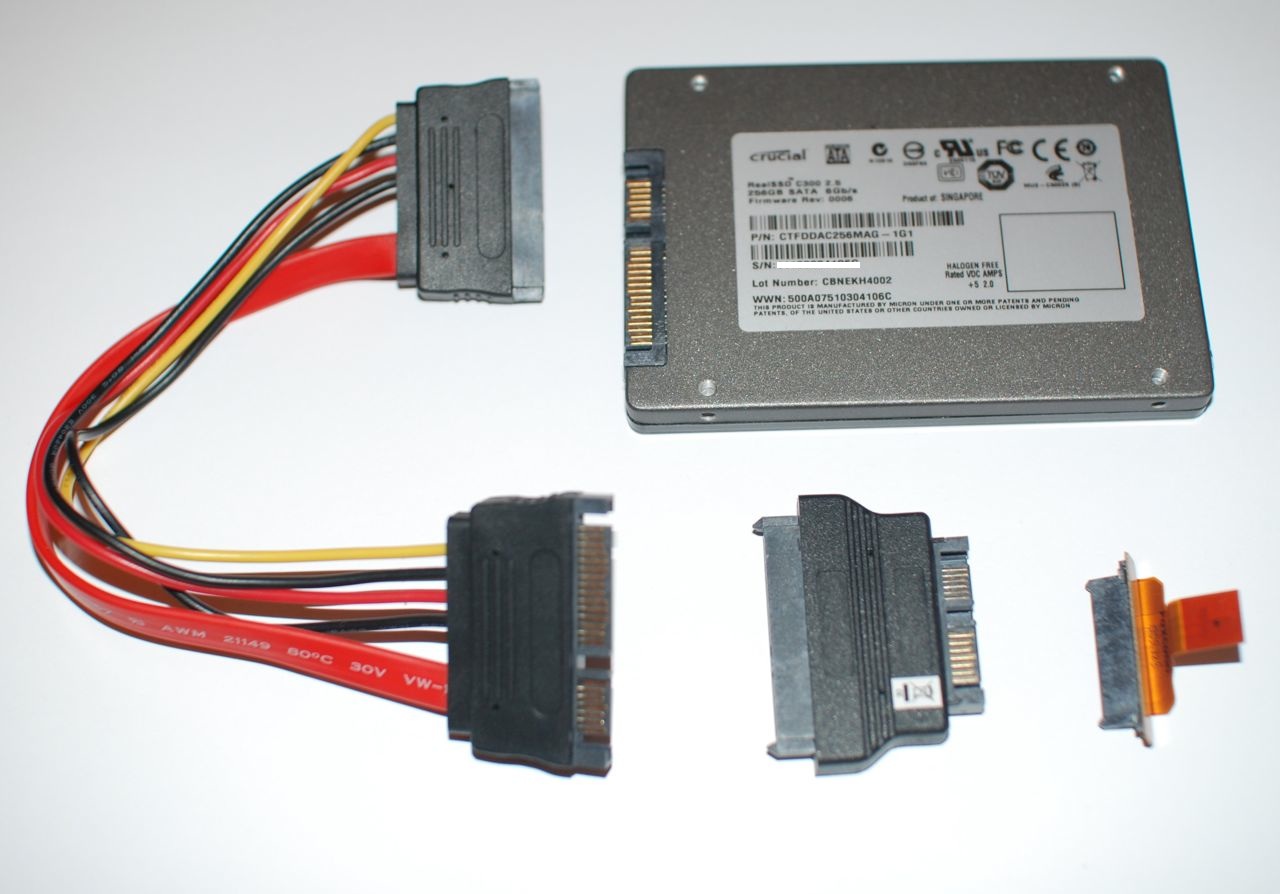 Motherboard connector > 13 pin to 22 pin SATA adapter > SSD.