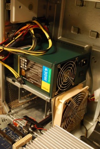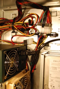 So I bought an Antec Earthwatts Power Supply, an ATX extension cable, some shrink tubing and some cable-ties.