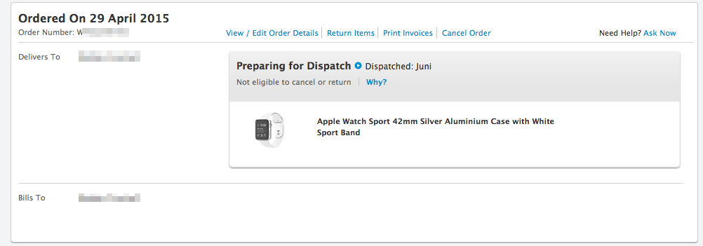 Ordered 38mm ss with classic black strap last night. Said June delivery but charged in the night and says preparing for shipment this morning. USA. Northeast.