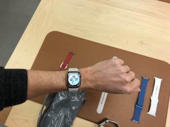 Go into the store and try them on and my advice is: do not take photos... you habe to choose in the store. If you take a photo, hold your phone as far as you can away from the apple watch, to get a realistic photo.