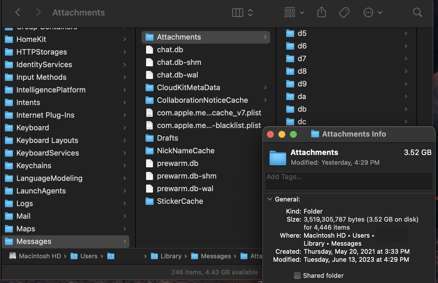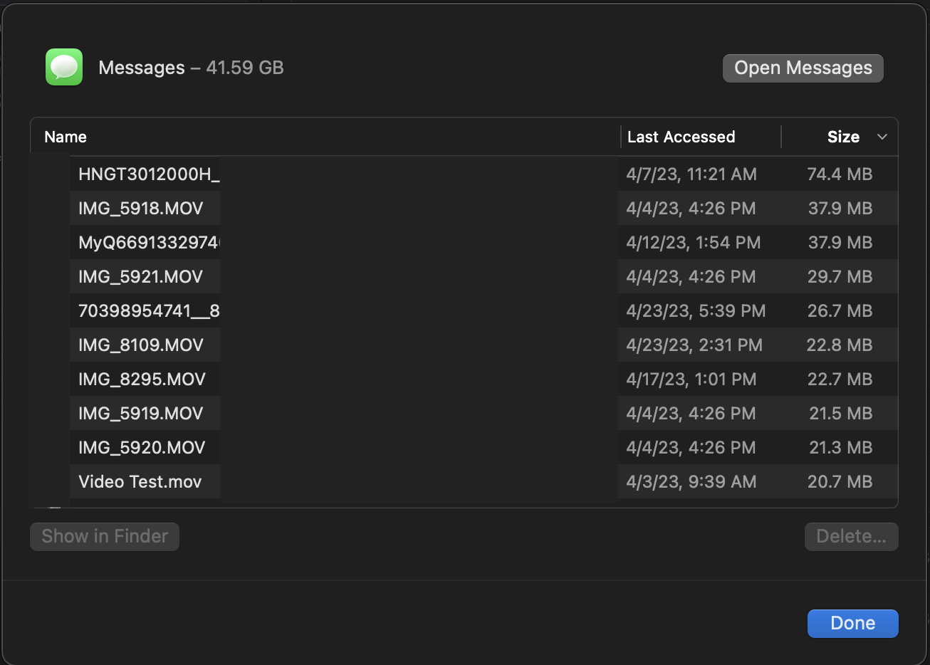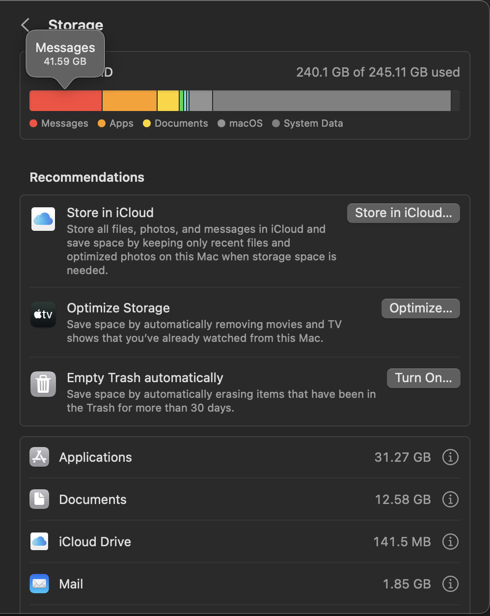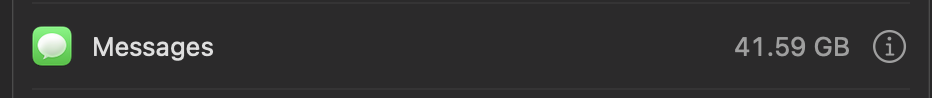 But I've noticed that I have a big chunk (41.59 GBs) of personal Messages attachments downloaded to my local disk that I don't need on my work computer. Months ago I searched where those messages lived in the Finder Library and deleted them per the steps found online. But to this day, when I go into System Prefs > General > Storage settings, it still shows that I have 41.59 GBs of Messages used on the disk. But when I "show in finder" and it takes me to the same folder in the Library and "get info" on the attachments folder, it only shows a reasonable 3.52 GBs of used space. When I click the "I" and it takes me to the window within System Prefs to see the list of attachments, it's only maybe 35 small attachments that probably equate to the 3.52 GBs of space that Finder says but the top left of the window stills shows the inaccurate 41.59 GB total.