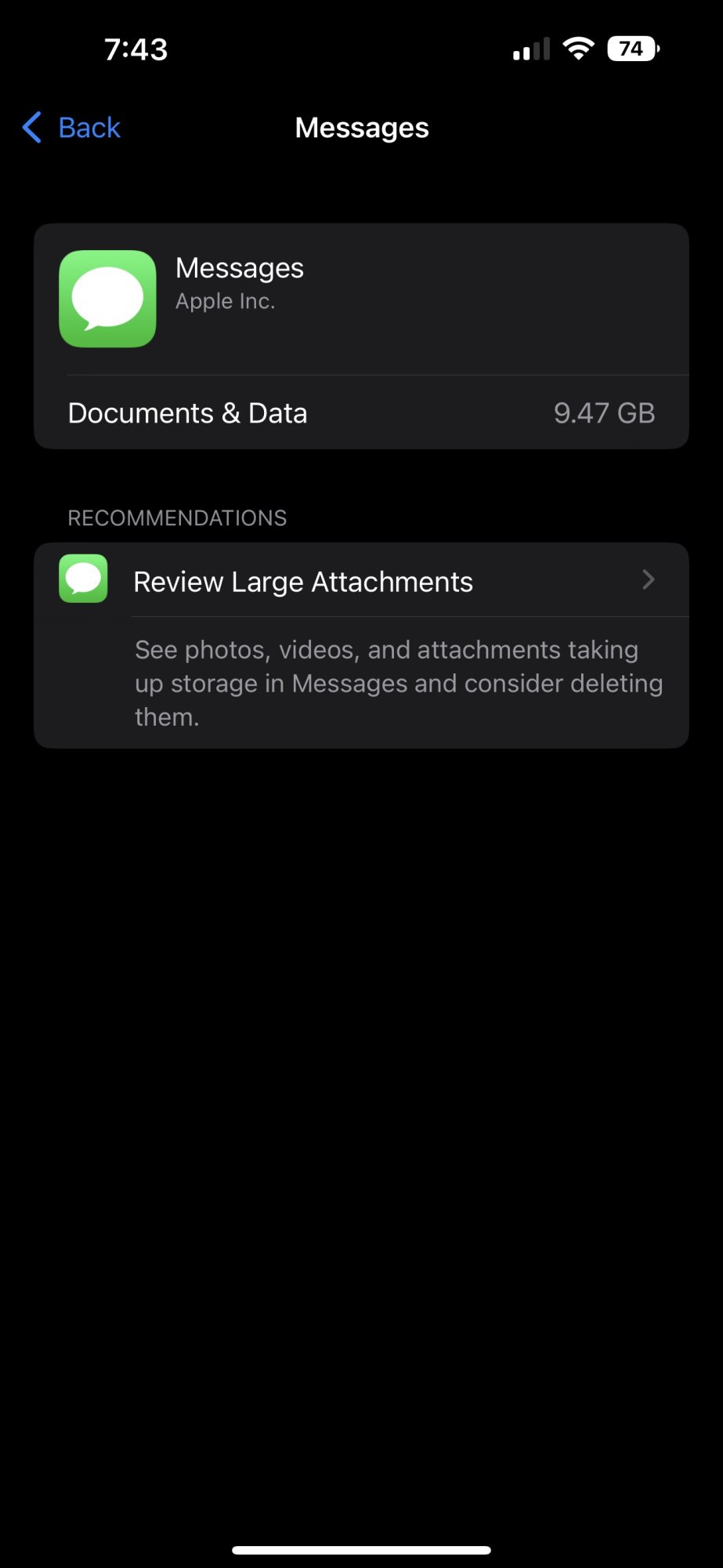Trying to clear the documents and data under messages to free up some room. Says the messages app is using 9.47gb…when I started this adventure it said videos were the main culprit, although when I clicked on it nothing would come up. Now it doesn’t list anything. Nothing shows up when I tap the review large attachments either. I cleared all that.