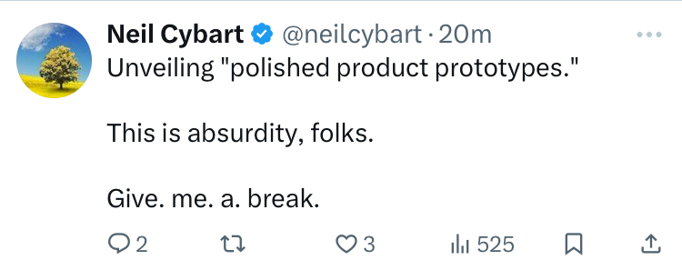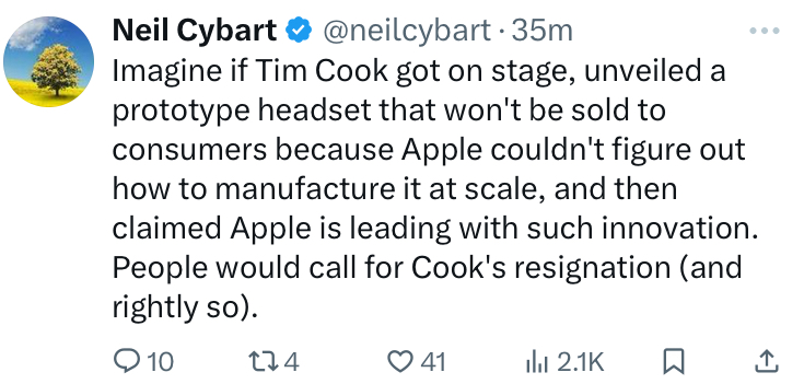 Zuck vs Cook. I’m here for it. I had to see what Apple fanboy Neil Cybart said. He’s a big Vision Pro booster. Unsurprisingly he’s not a fan. Just check out his replies in the comments.