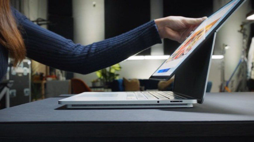 There are actually a total of three modes: laptop, stage, and studio. Laptop looks like a standard laptop computer, while stage is a middle tier mode that allows the display to be pulled forward at an angle for gaming and watching movies, and studio, which is a full tablet mode with the display folded all the way down.
