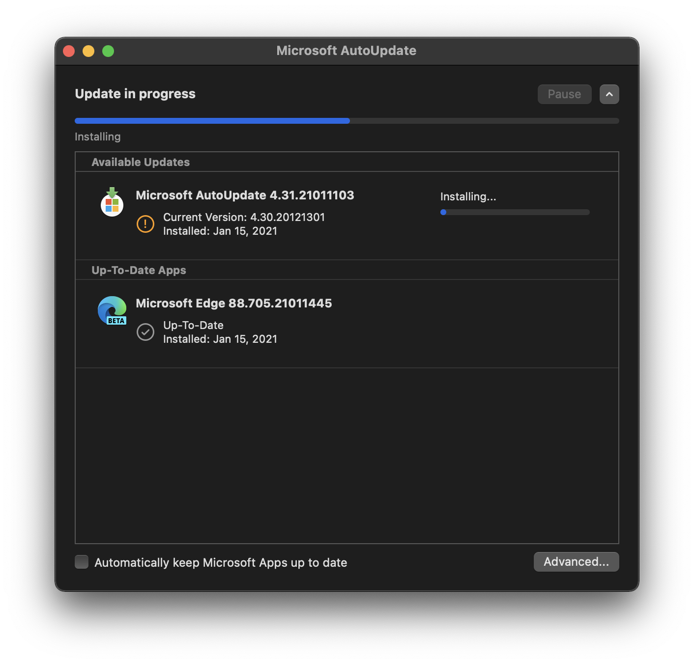 I decided to download Edge from the Beta channel. The first time I opened Edge, AutoUpdater opened and said there was an update, but it wouldn't update. I could run Edge, but it would hang when I quit and have to force quit each time. I was able to eventually just open AutoUpdater. It downloaded the update for Edge, but it has been sitting at installing with no progress. I understand it's a beta. Any ideas how to get the updater to finish installing?