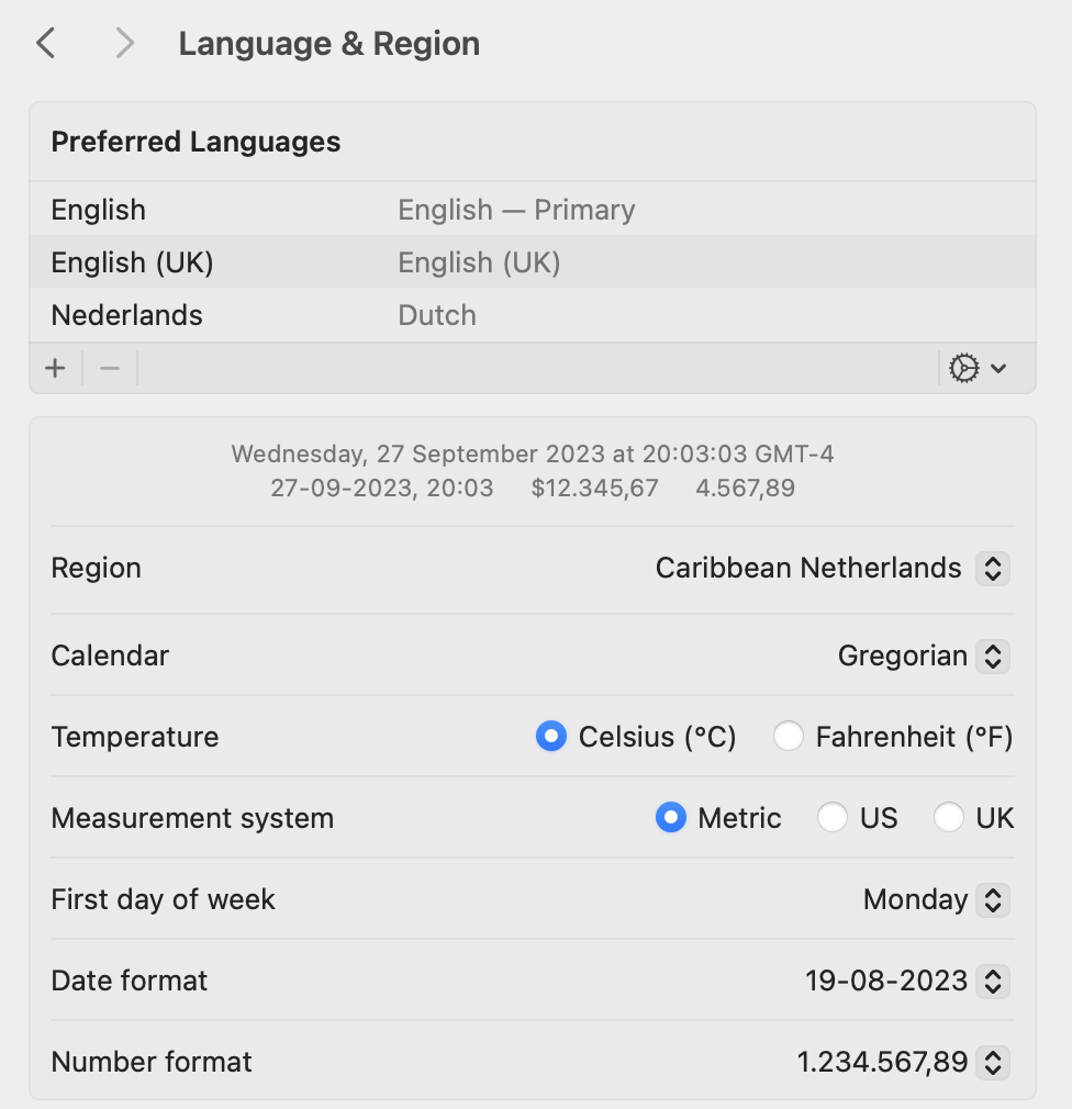 Since installing macOS Sonoma (23A344) Microsoft Excel 365 (23091703) doesn't use my Region setting (Netherlands) but instead uses the Primary Preferred Languages setting (English US).