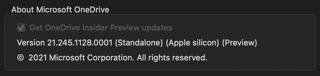 Thanks for that, I had OneDrive 21.215.1114.0001 and the Microsoft Updater wouldn't get anything newer, I had the option shown on the first post for "Get pre-release Microsoft internal updates", but not the button down below about Apple Silicon builds.Here is the link, direct from Microsoft if you dont want to wait for it to be made available to you.