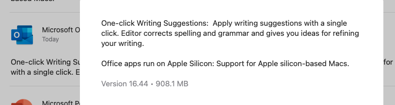 Same thing. In the App Store under Updates, Outlook shows 16.44 and status is "Open" (as opposed to "Update") suggesting it has been installed. However, Outlook is still at 16.43 (have restarted Outlook and rebooted my Mini). Activity Monitor confirms its running as an Intel app. My other Office apps did update. Perhaps 16.44 got pulled from the App Store?I'm not seeing the new 16.44 Outlook. Seems like it's Word, Excel, Onenote and Powerpoint so far.