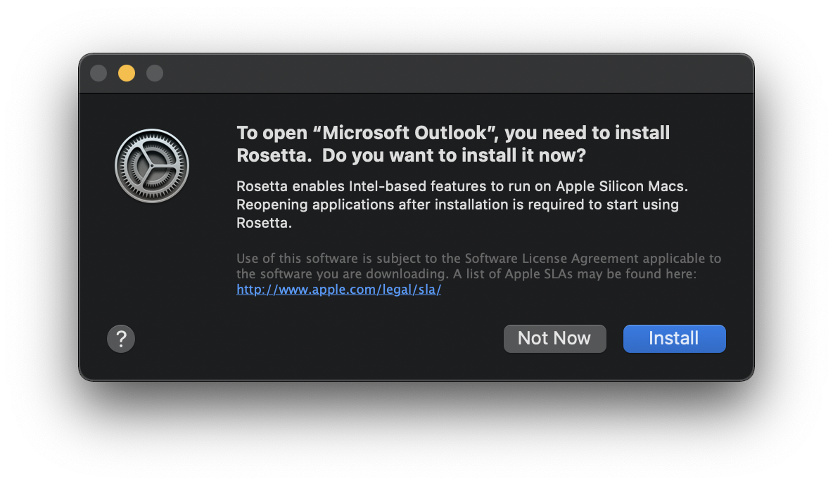 I downloaded it from the Store also and its prompting me to install Rosetta:Same thing. In the App Store under Updates, Outlook shows 16.44 and status is "Open" (as opposed to "Update") suggesting it has been installed. However, Outlook is still at 16.43 (have restarted Outlook and rebooted my Mini). Activity Monitor confirms its running as an Intel app. My other Office apps did update. Perhaps 16.44 got pulled from the App Store?
