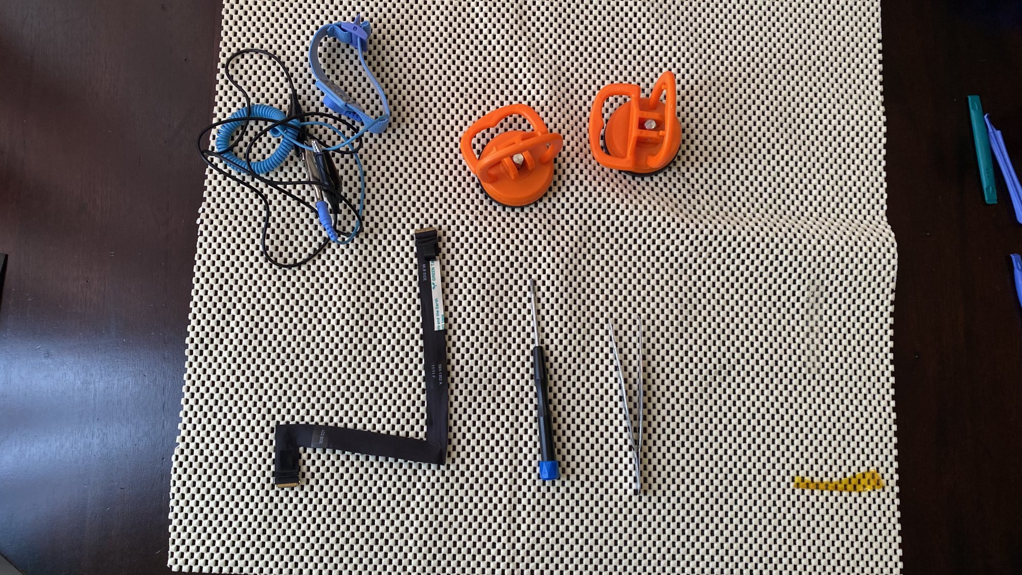 When I was replacing the panel the first three cables connected OK, but difficulty with the last display port cable. It’s the one with the latch and little black ribbon for a pulling out the cable from the circuit board connection. It did not seem to seat properly and when I pulled the latch down it would just fall off. When finally got what I thought might be an acceptable connection I ended up with a blank screen, with a fully functional computer otherwise. I can connect to it with screen sharing or can connect with internal and external hard drives in target disk mode, and all seems normal. iStat Menus shows GPU core at the bottom watts, volts and amps, and see the amps is 0.0. Does this mean no power? The cable which is next to the display port cable not seated properly?