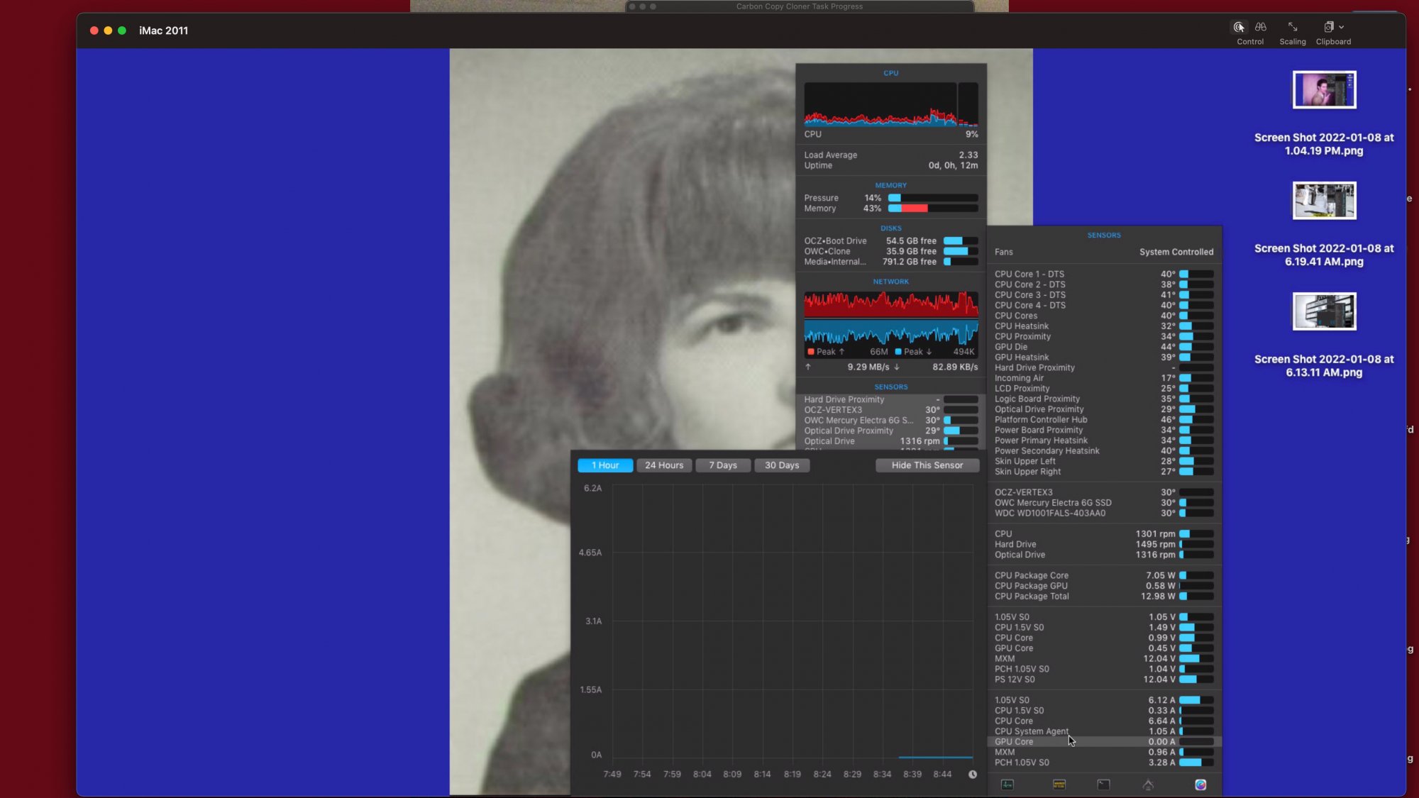 Purchased this Mid-2011 iMac 27” (12,2) new, When it was still $2000 and perhaps a little more as I recall The price dropping $500 or more six months later after I purchased. Grrr.. I replaced the optical drive with two SSD‘s on two separate occasions, and no problems taking apart and putting it back together; and function perfectly over the next 10 years. Recently iStat Menus showed the optical bay fan at zero RPM and occasionally 143 rpm. This iMac has been very faithful and very fast. Currently running High Sierra. I have a newer iMac 5K 27 inch running Big Sur and able to screen share with the older iMac over ethernet and see a normal screen. iStat Menus shows the optical bay fan is now functioning and as you can see running very cool. I put in target disk mode and copying the internal 1 TB hard drive with Carbon Copy Cloner, and then I’ll clone the start up SSD to another SSD on my next day off, Tuesday.
