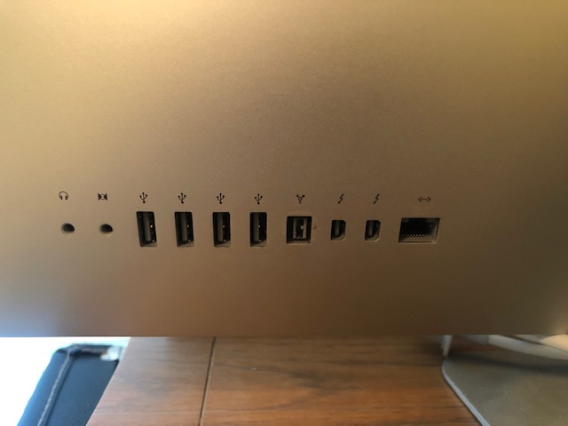 Here's a photo of the ports on the back of the iMac. I was going to post a photo of the brightly colored vertical lines on the screen but since they have somehow disappeared I can't do that.