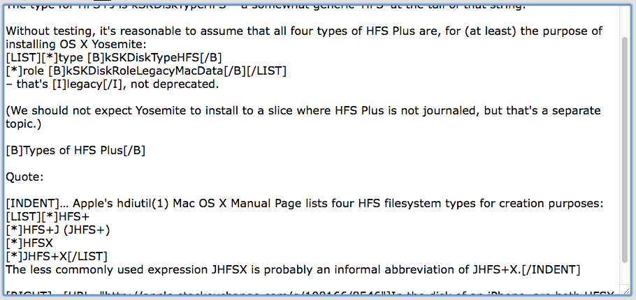https://forums.macrumors.com/threads/1807308/ some lists, some quotes, a little use of colour and some sized text.
