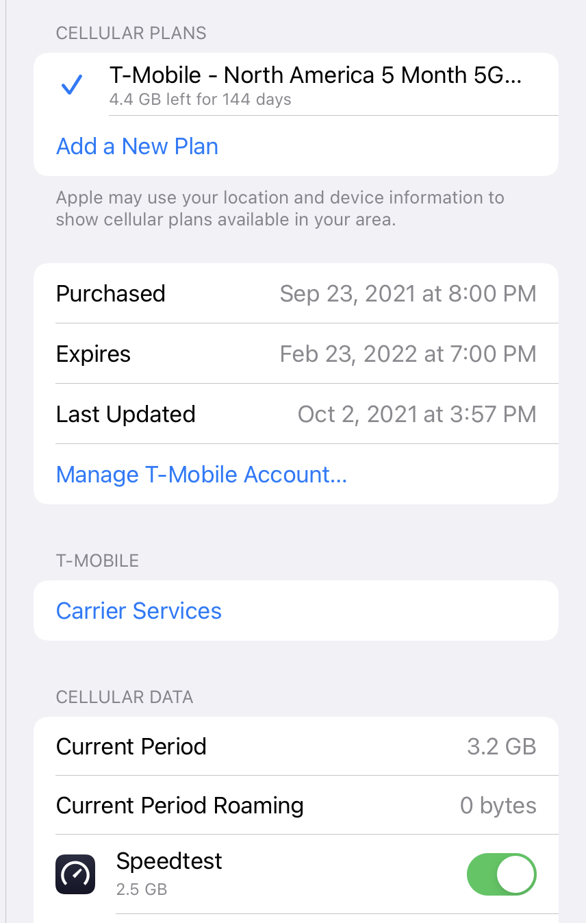 It looks like T-Mobile doesn’t count that test data against your limits if you connect to the T-Mobile test site. I’m not aware of all possible situations but I’ve run the Ookla app against the T-Mobile site a few times with the pre-paid 5 GB plan and while the Cellular settings page says I’ve used 3.2 GBs the actual account says I’ve only used 600 MBs.Tried the 5G for the first time on my new Mini 6 with T-Mobile - 755Mbps down, 86Mbps up. Seattle.