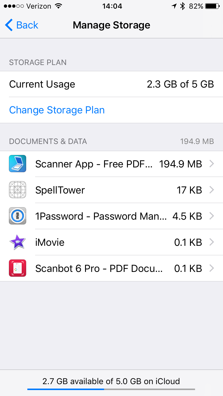 iCloud storage is currently at 2.3 GB of 5 GB used, and the storage is all labeled "docs." Under Manage Storage, it shows that documents and data are only 194.9MB.