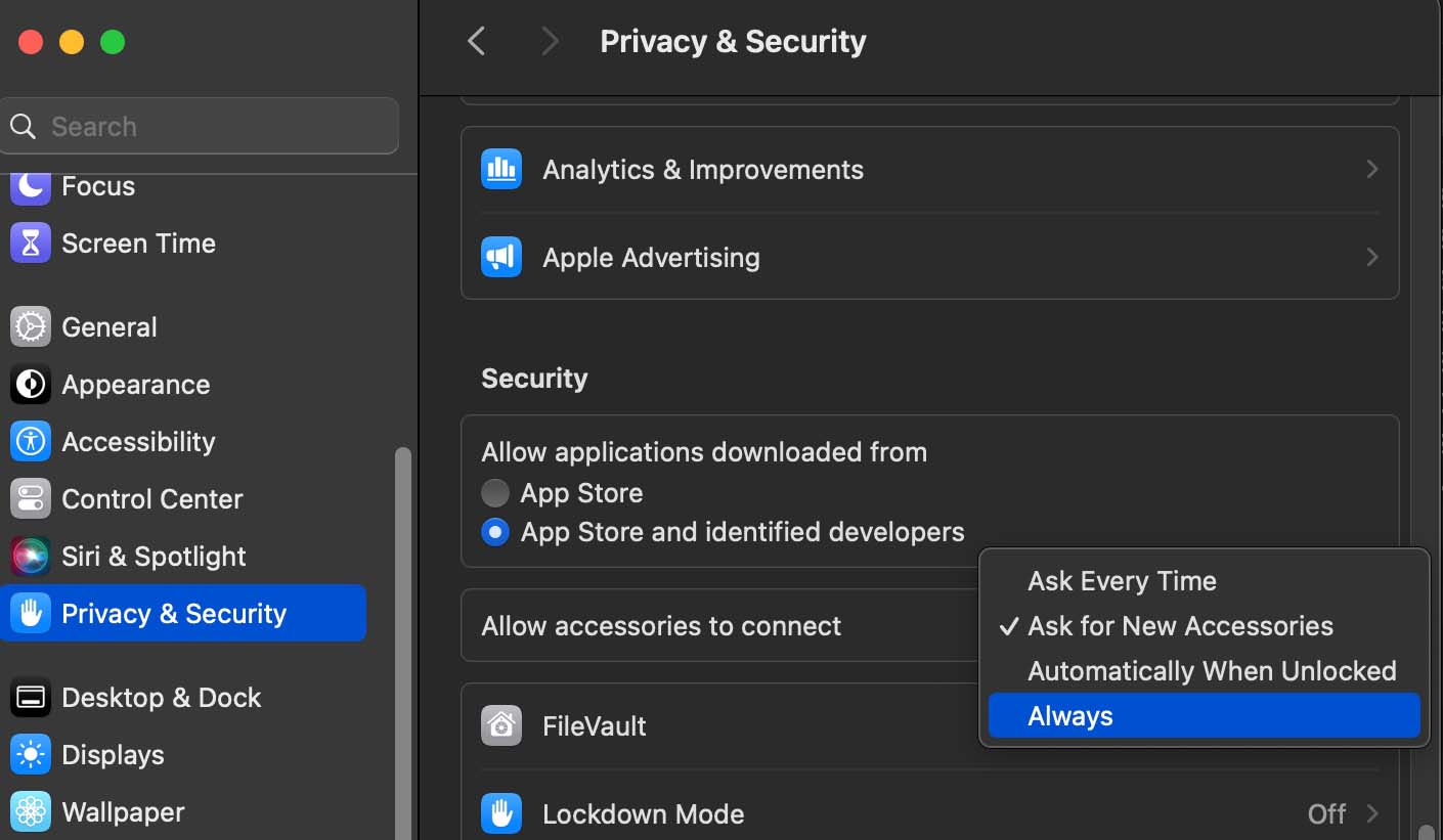 I have a Caldigit TS3 Plus Dock. it requires you to allow accessories to connect. See their instructions in the link below. Only problem is this option doesn't exist in in Sonoma. I called Apple they said to get support from Caldigit.. its a vicious cycle. Any Ideas?