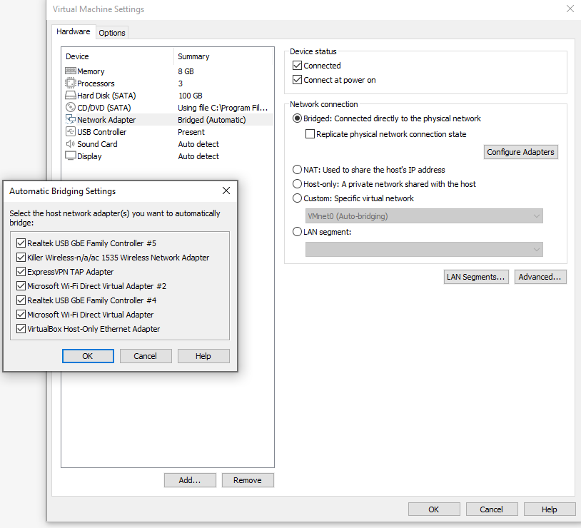 Had a lot of trouble, especially getting VMware tools in to have full screen, but got Catalina on a VMware 16.1.2 install on windows 10. Got all my apps installed and registered. Then, VMware offered to update, I let it - mistake - broke everything. Re-installed 16.1.2, but when it comes to the VMware network - how do you connect? - the wifi option is greyed out, so I end up with ethernet LAN installed, and have no way after in the settings to add any network adapter other than another ethernet LAN. What am I doing wrong? How can I get my VMware installation to give me the wifi option? Thanks - Mark