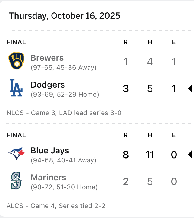 That's a solid prediction. I need to see if I can find a Blue Jays t-shirt locally. I'm temporarily their biggest fan in SW FloridaMy prediction for the WS: Dodgers in 5.