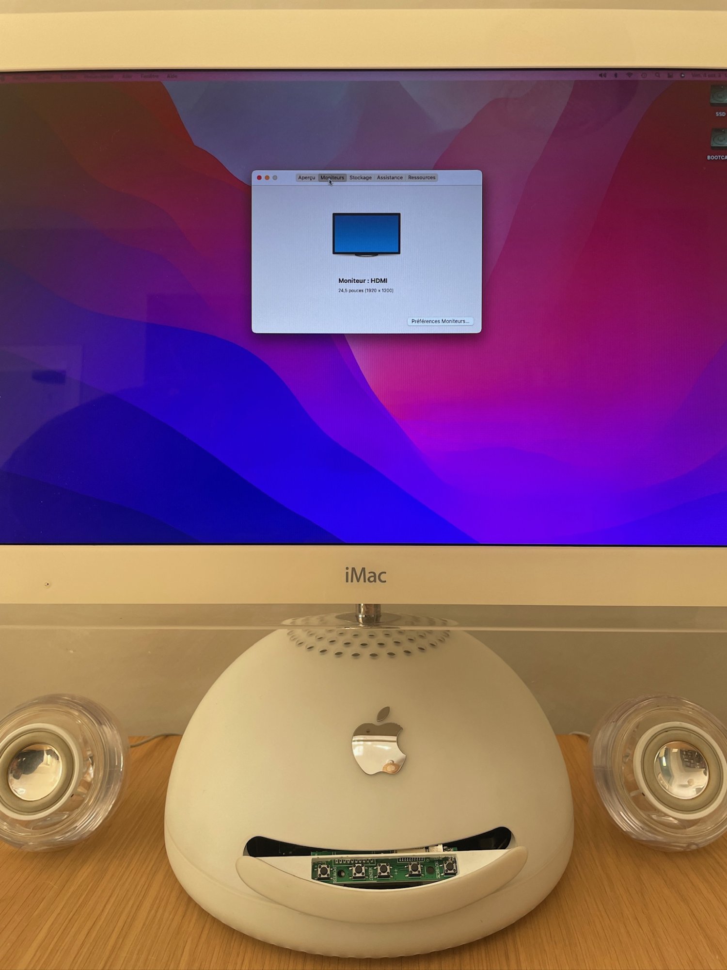 The NUC was a 2015 one, as provided by my "customer". So, it was not particularly fast! I at least changed the hard drive by a SSD to improve the speed. The advantage of this little NUC is to be able to use the original power unit of the iMac G4 to power and the display, and the NUC.