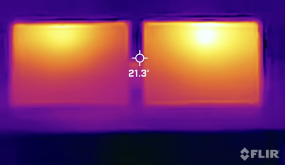 The M1 MBA is rotate 180° from the image you have, but in this image, the white is the peak temperature at 117 °F, with ambient blue or black being 72 °F. A lot more color spread between the cooler parts of the laptop, 91 °F on the upper left and right corners of the image being purple, and the white in the peak in this image. And, the heat concentration is easier to see, which is where you expect it to be, the SoC location.