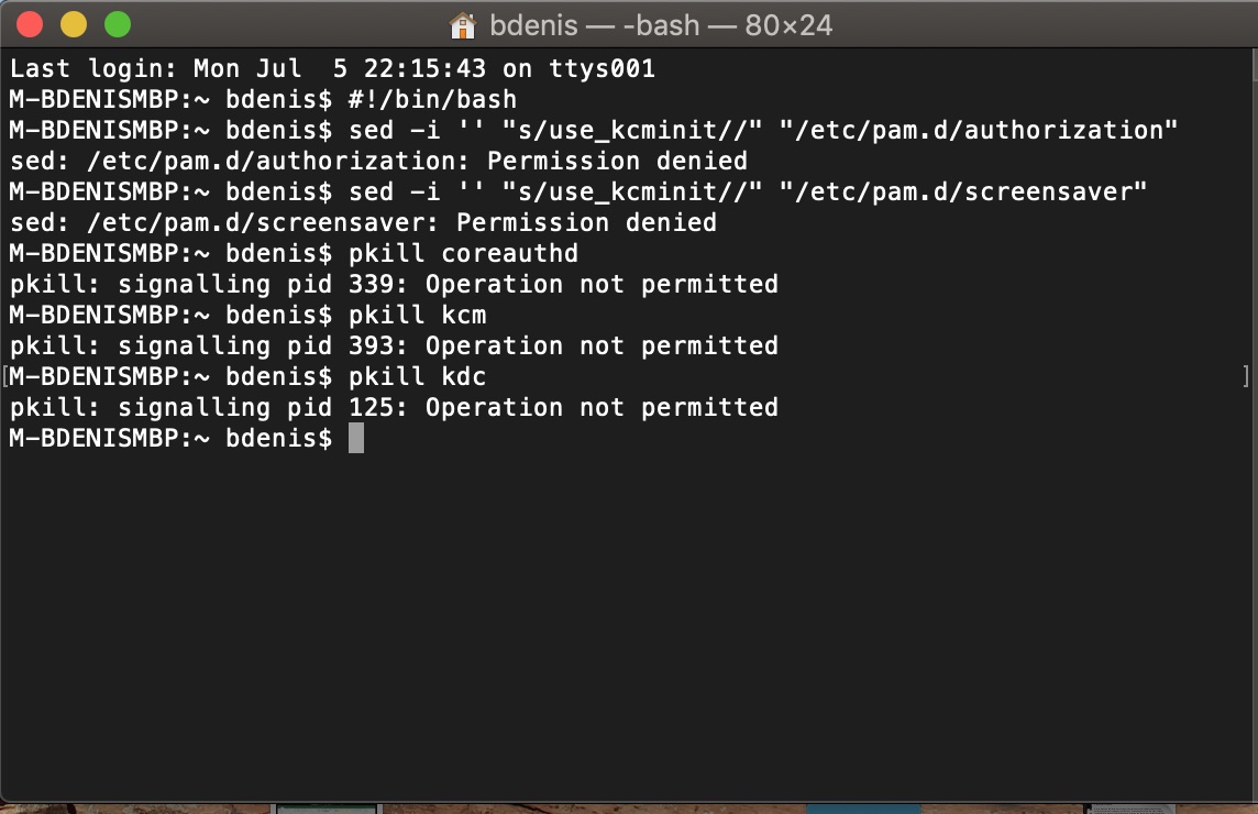 Bash:#!/bin/bash sed -i '' "s/use_kcminit//" "/etc/pam.d/authorization" sed -i '' "s/use_kcminit//" "/etc/pam.d/screensaver" pkill coreauthd pkill kcm pkill kdc